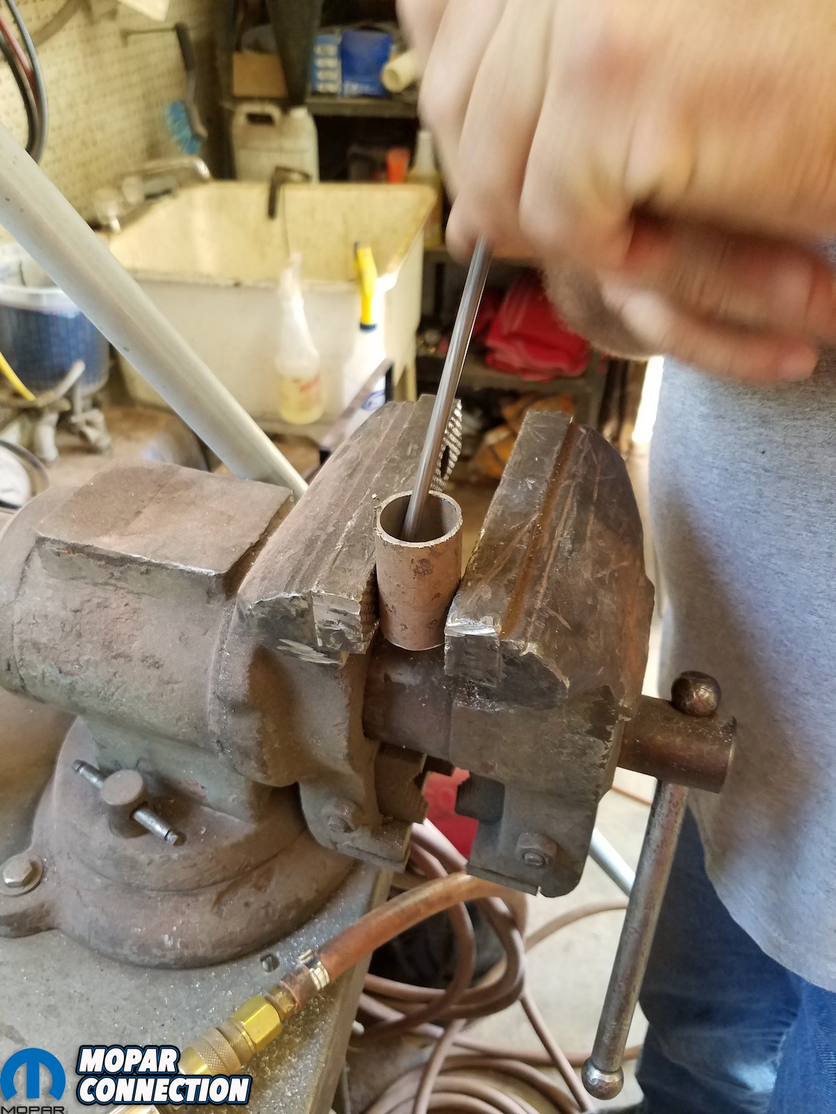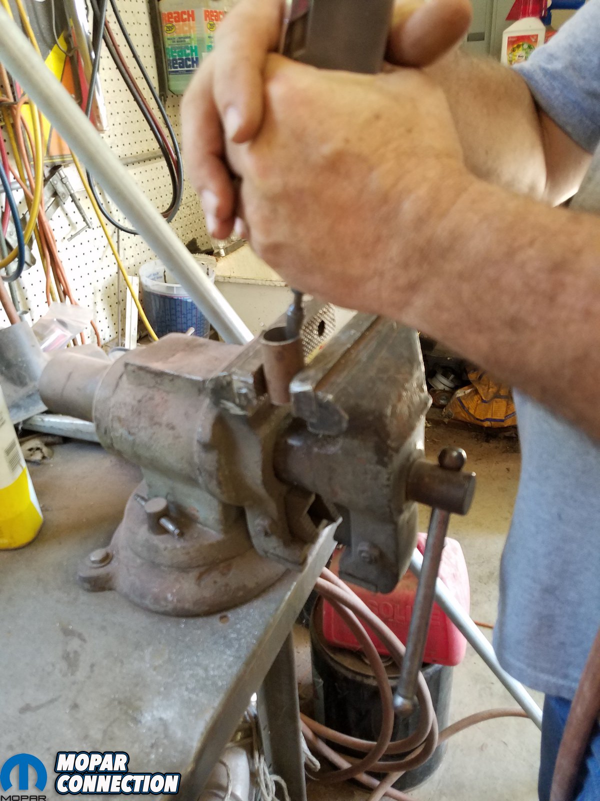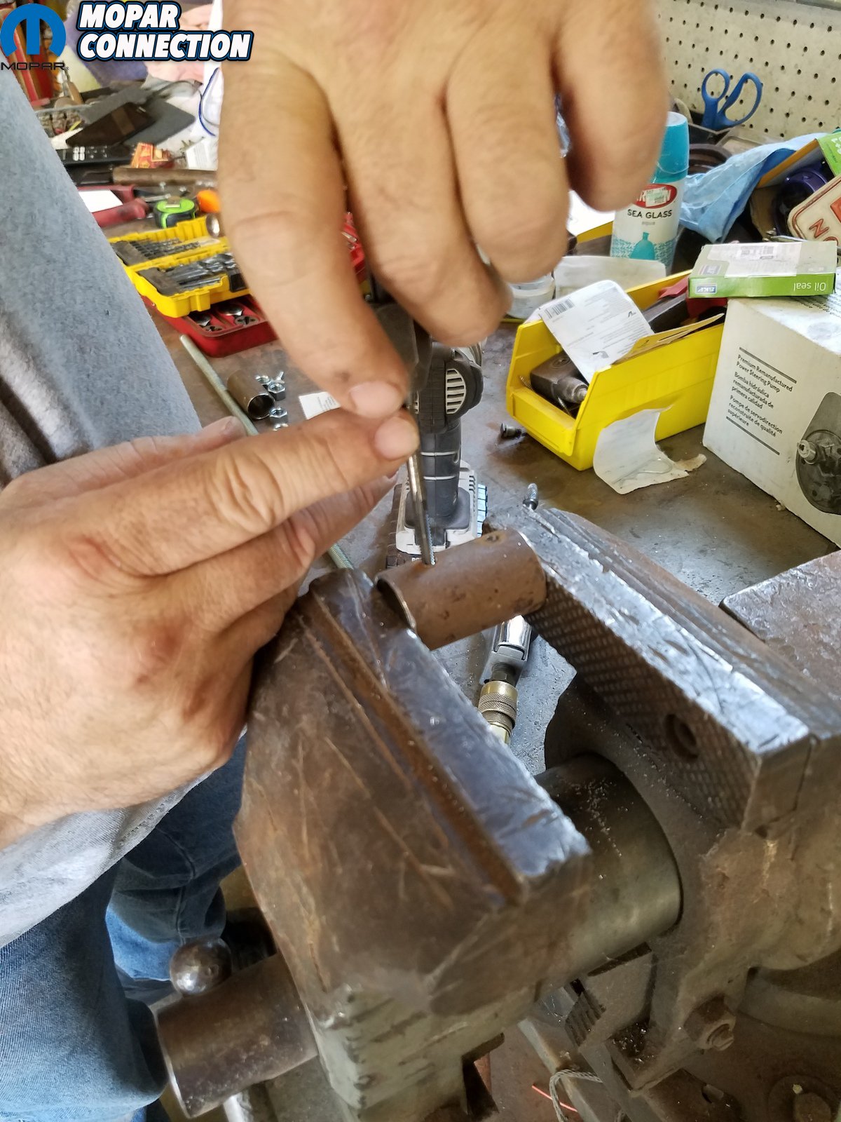 Above left: We used a 5-foot long length of 3/4-inch electrical conduit; a short 1-inch diameter piece of scrap tubing; a 2-foot long piece of 7/16-threaded rod; (4) 7/16-inch nuts for the rod; and (4) 10/24 thumb screws. Above center and right: Dave used a dremmel tool with a carbide bit (both versions showed) and some metal files to debur the pieces.