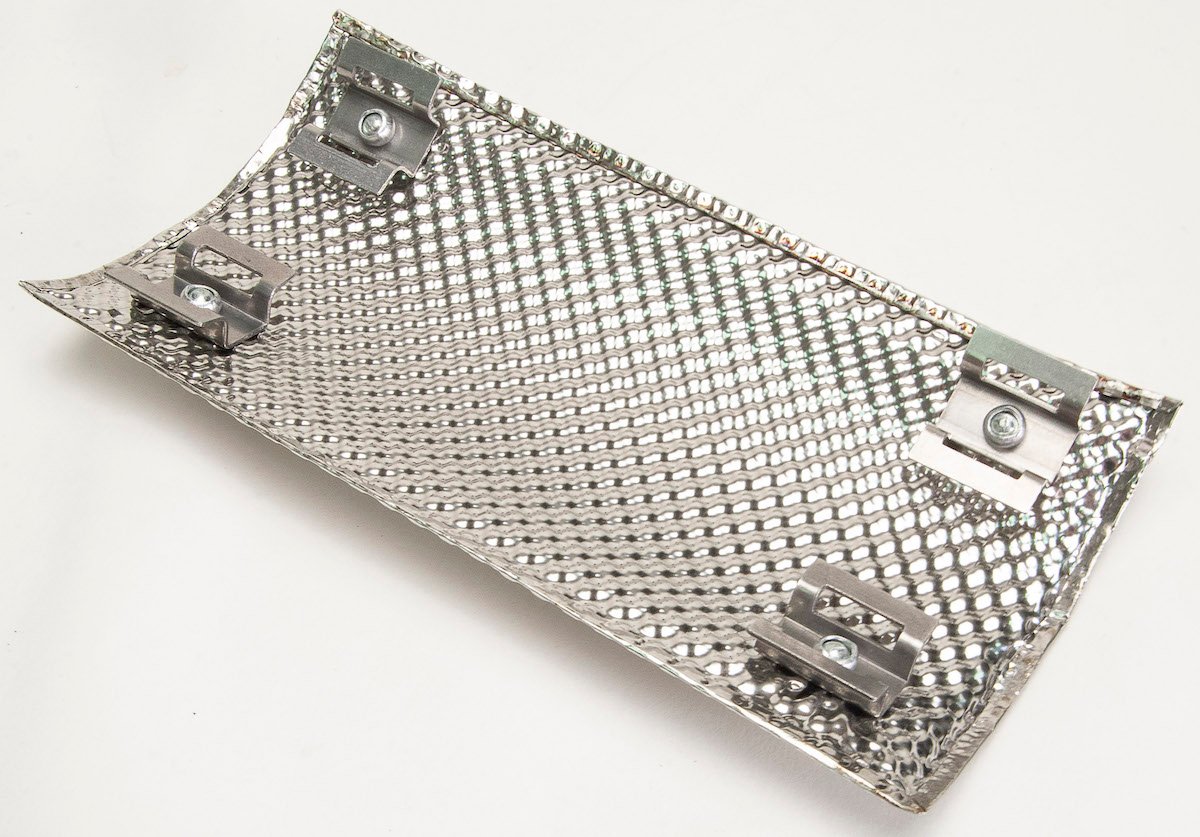 The high-temperature insulation material is lightweight and easy to install with a pre-formed curved shape. A 2,000°F temperature rating is the result of the 304 stainless steel barrier coupled with an insulating inner layer. Seams are welded for robustness. Simple ½” standoffs with clamps allow for some space between the shield and the component which it protects.