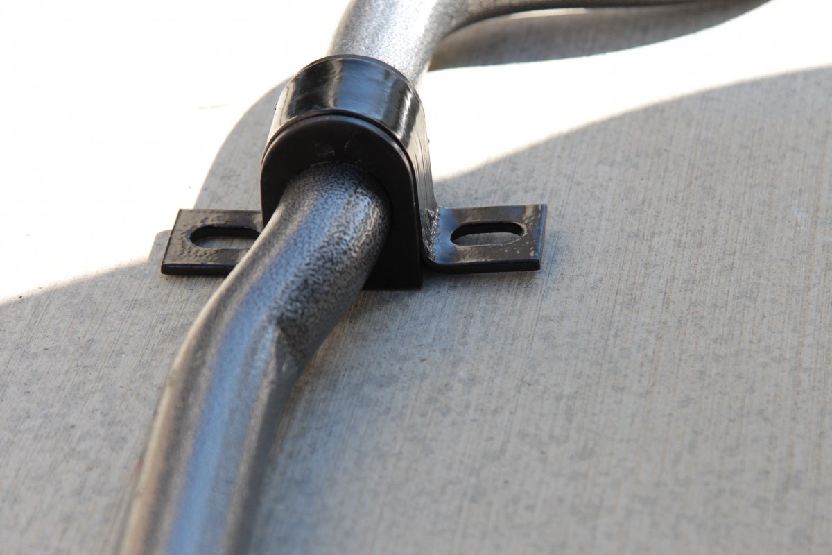 We used anti-seize on the four mounting bolts that come with the rear bar. While the front bar reused the factory bolts, the allen head bolts for the rear will fit better than the factory bolts. The rear bar is slightly larger, making the bushing and clamp larger in diameter as well. This affects the mounting of the clamps and the bolt heads end up being too close and prohibits tightening them down. We left the clamp bolts slightly loose so we can easily center the bar. When we attached the bar to the end links, we left those bolts loose as well until we lined up the rear bar parallel with the ground (or the frame, in our case since we used ramps).
