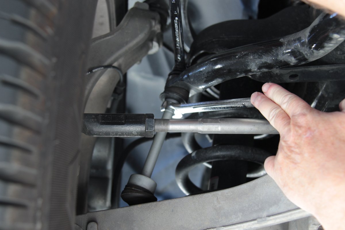 We initially set up the end links to be similar in length to the OE links, leaving the jam nut loose for final adjustment. The assembly of the Hellwig end link is pretty simple, just remember to apply the gooey lube on the bushings first. You can press the bushings into the links with a vise, or use a deadblow mallet to persuade them into the links with a couple of medium whacks. No need to go mortal kombat on them, but lining them up and giving a couple firm strikes will pop them into place. Pressing them in by hand can be messy if the bushing slips, so we opted for the deadblow hammer.