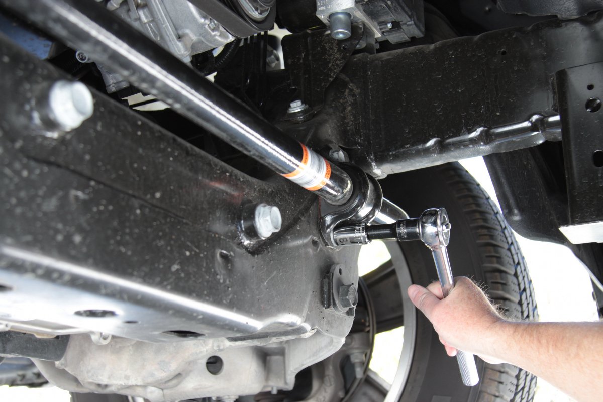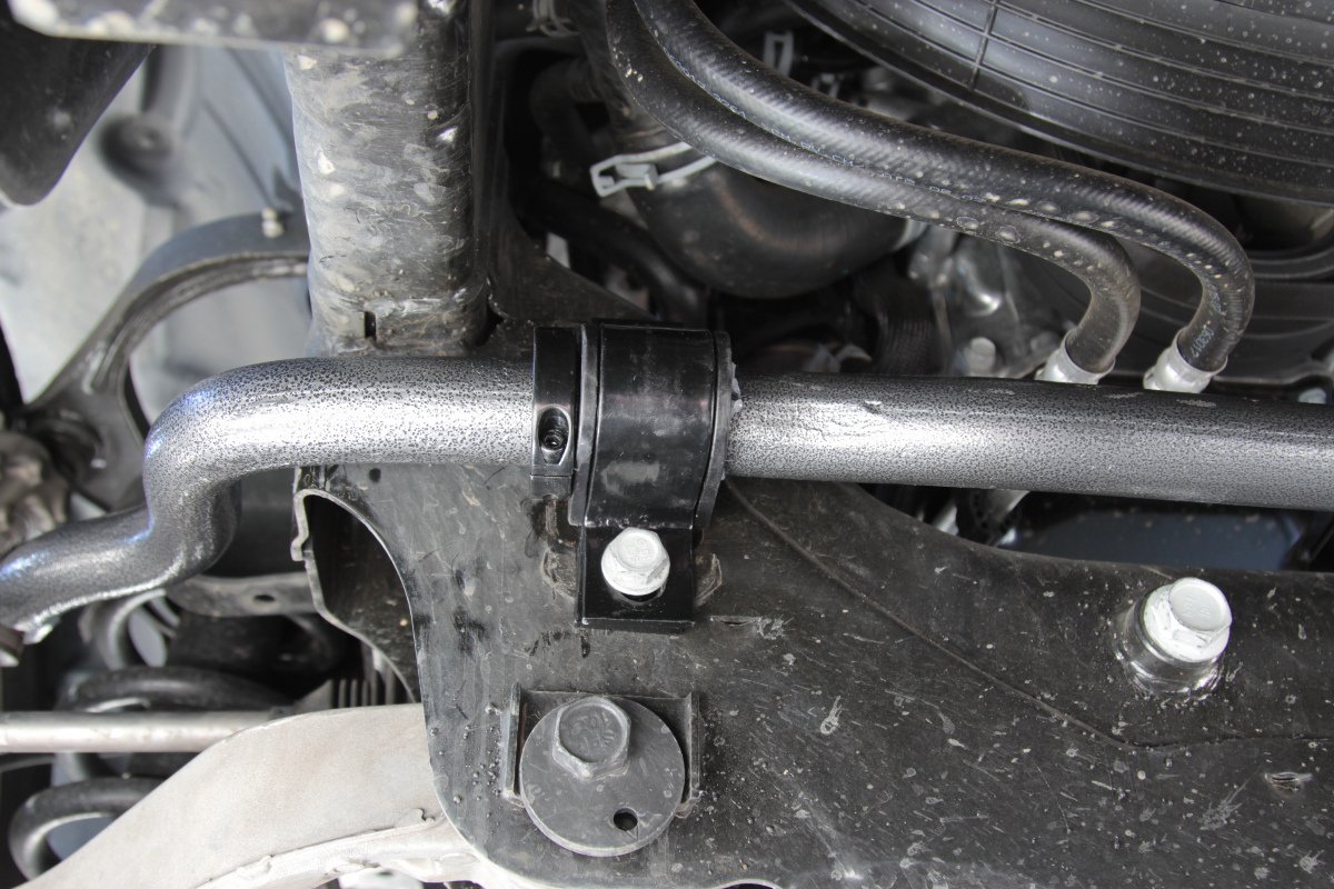 With the clamps attached to the bar and the bar centered, we first tightened the clamps, and then the collars. There is a little play with the clamps from side to side, so don’t tighten the collar clamps completely just yet. Once the bar is centered and the clamp bolts are tightened to 25-30 ft-lbs, and the nut is tightened on the end links, the collar clamp can be tightened. For the end links, Knaus says that when you see the rubber bushings begin to compress, that’s when you’ve tightened them enough; there are no torque specs for these.