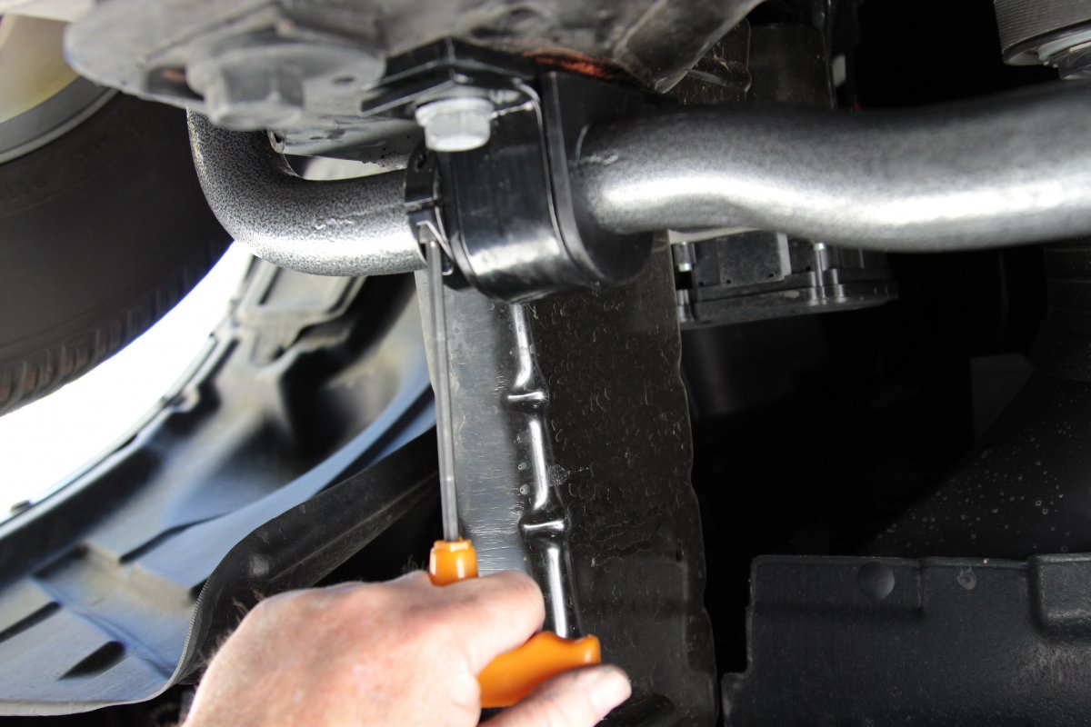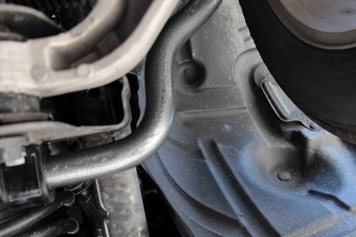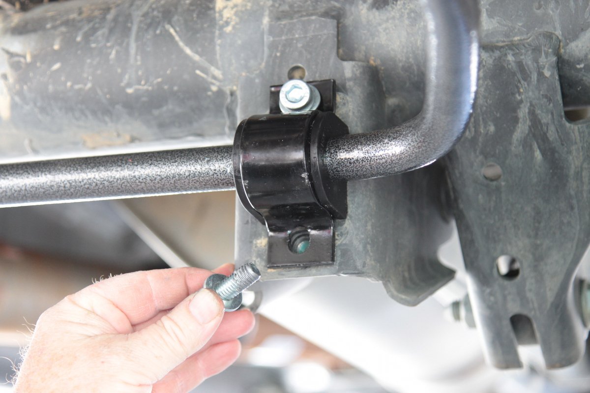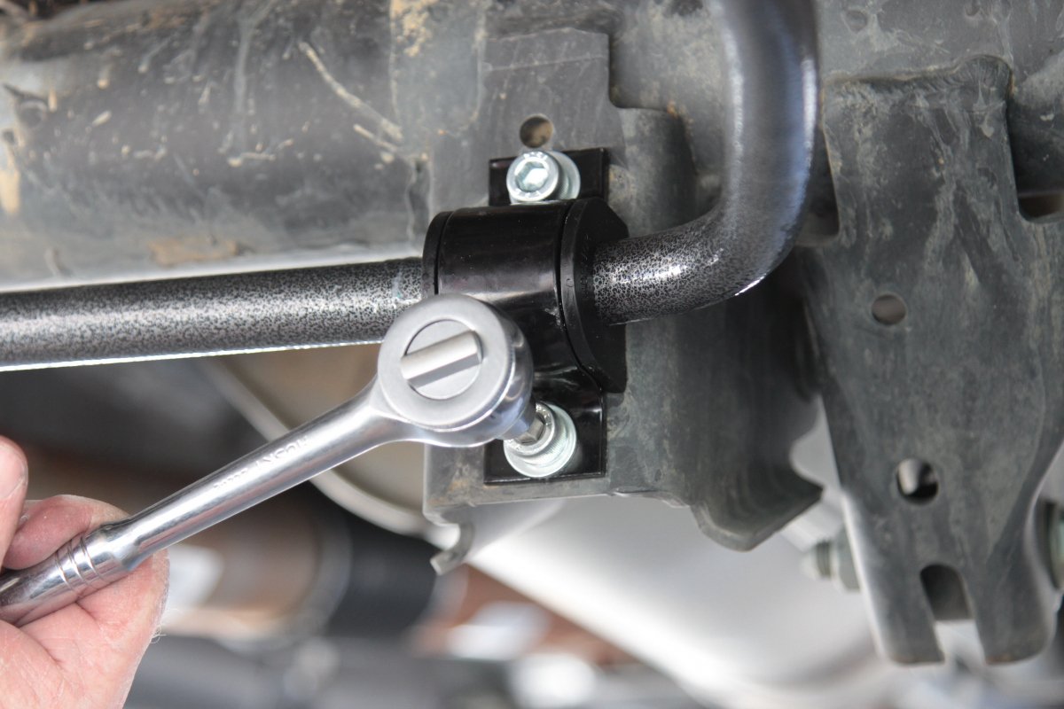 The rear bar is a bit unconventional, but works much in the same manner as the front. Instead of the ends reaching forward, like a typical rear bar, they reach towards the rear. If you don’t have a rear bar, Hellwig will provide the end link kit separately. If you do have a rear bar, you can use the factory end links, but we opted to use the Hellwig kit. The bar removes in similar fashion to the front bar, however, it’s far lighter and much easier to remove. We left one bolt on each clamp while detaching the end link at the bar end, and removed the end link once the bar was completely removed – it’s a little easier, and safer. If you detach the end link at the frame only, be aware that it could swing down like the pendulum from hell and clock you one. An 8mm socket was used to hold the lower bolt while we removed the nut on the end link.