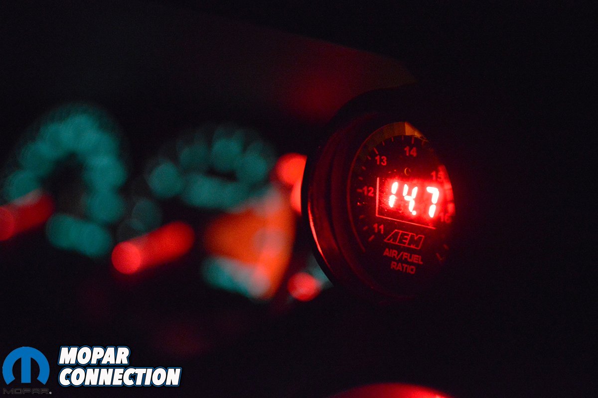 For modifications, the interior features an aftermarket JVC CD player and an AEM AFR gauge/ wideband sensor in place of the factory boost gauge. An A-pillar mounted triple gauge pod has been added and fitted with an Aeroforce Interceptor gauge, Autometer boost gauge and an Autometer voltage gauge to let Matt know exactly what the engine is doing at all times. The exterior is exactly as it rolled off the showroom floor with the addition of clear side marker lights, aftermarket fog lamps, a billet shorty antenna and a SRT nostril badge. The original front crosshair grille mesh has been deleted to make room for that big intercooler.