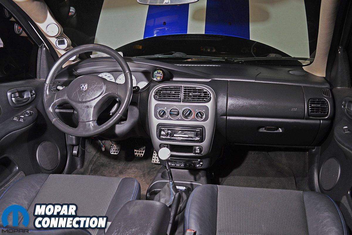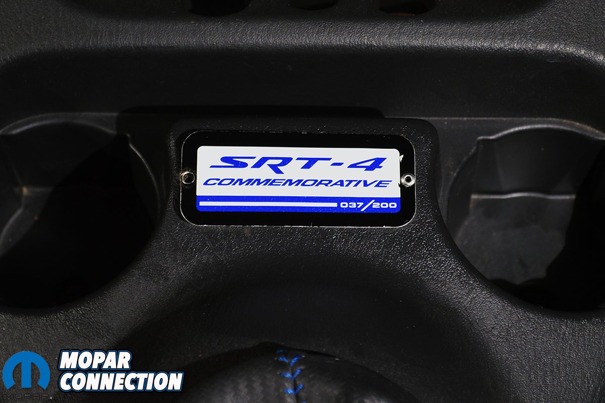 Underneath the car, Matt says his SRT-4 rides on BC coil-overs and stock SRT-4 wheels that have been refinished black. Drilled and slotted rotors aid in quick stopping power combined with the factory four corner disc brake set-up. On the inside, it features all of the original Commemorative Edition items. Straight from Dodge, the SRT-4 Commemorative Editions received blue stitching on the floor mats, shift boot, seats and steering wheel along with stainless steel “Dodge” door sill plates. On the center console just ahead of the cup holders, the #37 of 200 numbered plaque is mounted.