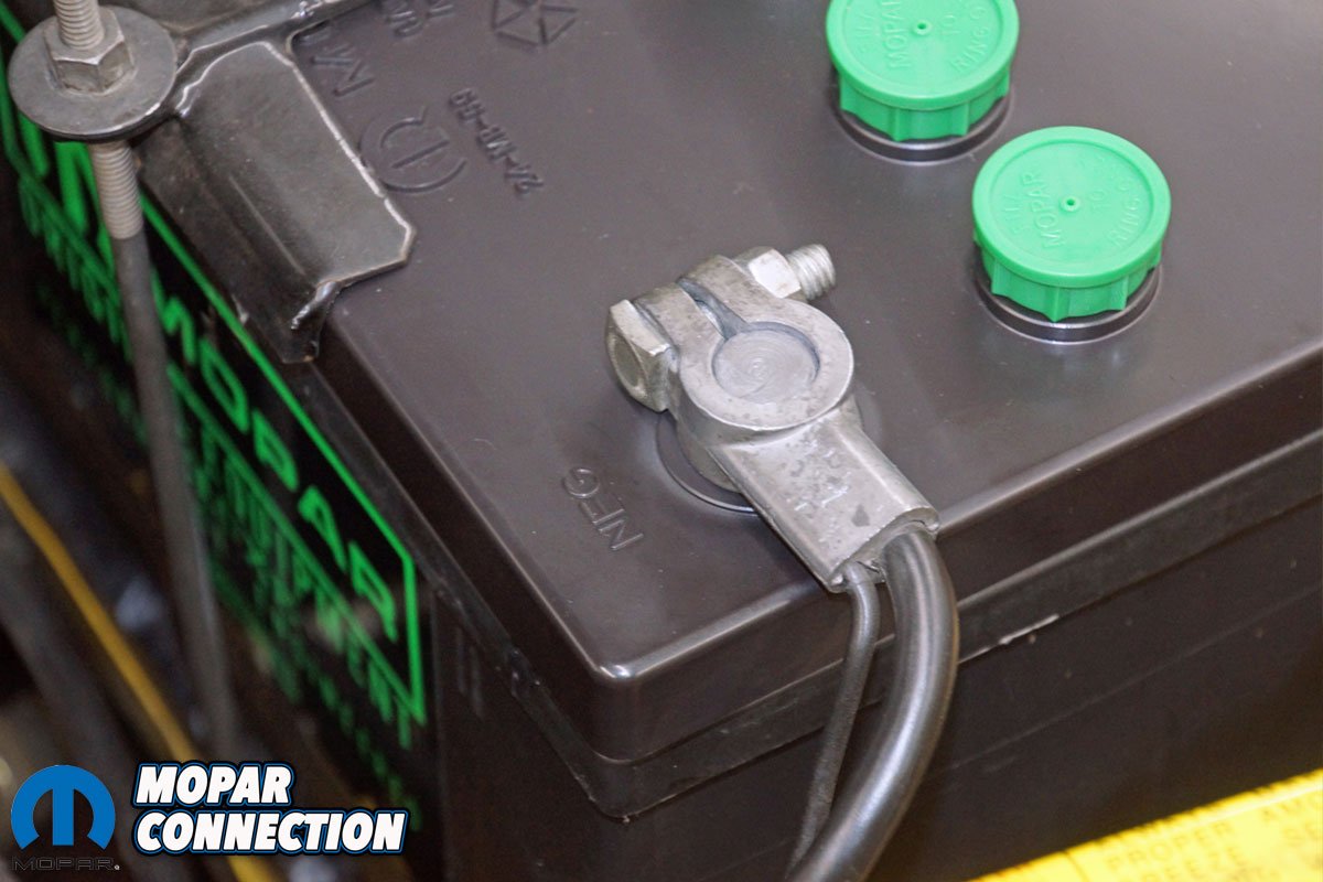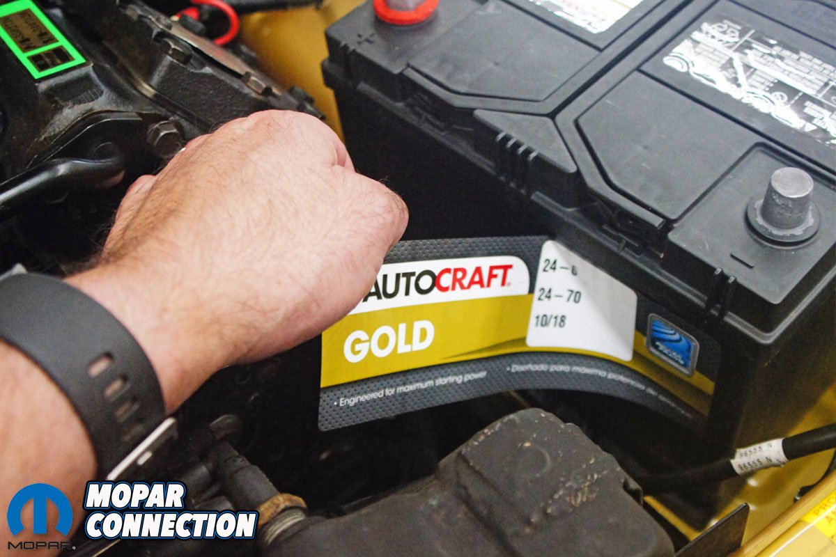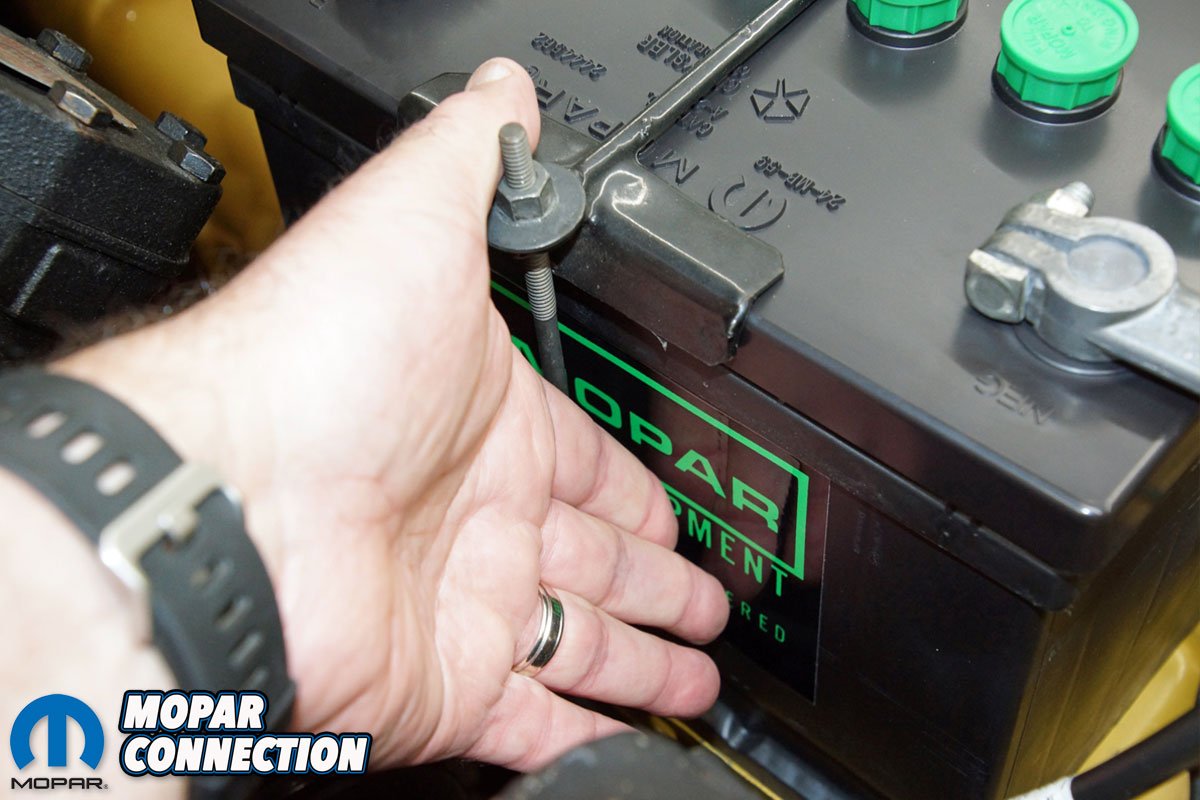 Above Left: The battery topper dropped over the terminals and laid flat on the top of the battery. Our battery had recessed maintenance caps. If the battery did not have recessed caps, YearOne provides terminal extenders to account for the additional space for the height of the maintenance caps. Above Center: The battery topper fits nicely but required a minor adjustment of the battery hold-down (a slight bending of each 90° portion of the hold-down). The battery cables were reattached (negative last), and even with the topper in place, there was proper clamping of each cable terminal end onto each terminal. Above Right: Dodge Connection provided us with a battery decal that matched the color of the topper’s caps. Although the original factory batteries had all the pertinent battery information molded into the case, this sticker does an excellent job of representing the battery.
