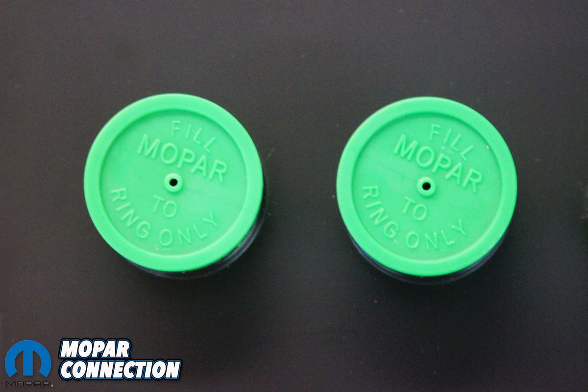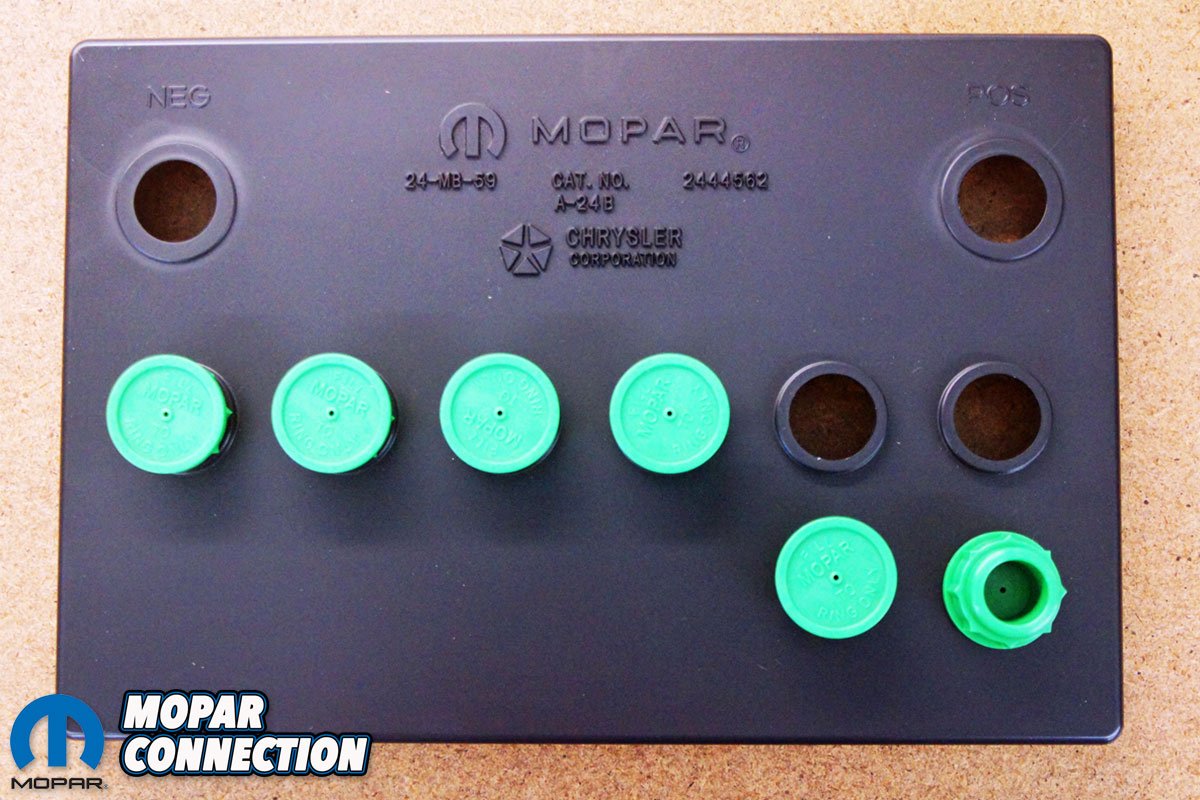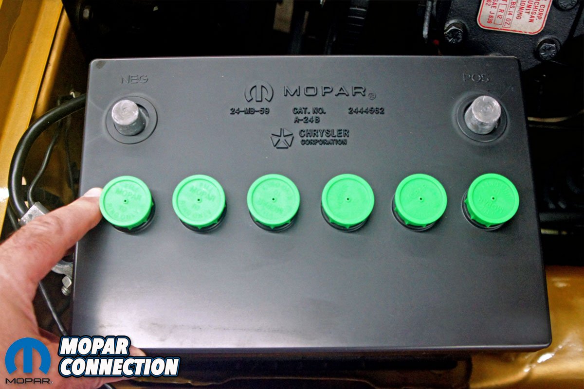 Above Left: The YearOne reproduction style cover (battery topper) provides the appearance of an older Mopar battery. We selected the green cap cover (part no. MBC24GRN). Above Center: The topper has the proper part numbers and the Chrysler and Mopar symbols, just like the original batteries. The battery topper can be ordered for a group 24 or 27 sized battery. Above Right: The battery topper includes the proper colored caps. We selected green caps, but there are red or yellow cap battery covers. Mopar installed all three colors based upon the model and amperage requirements. YearOne provides a chart for reference.