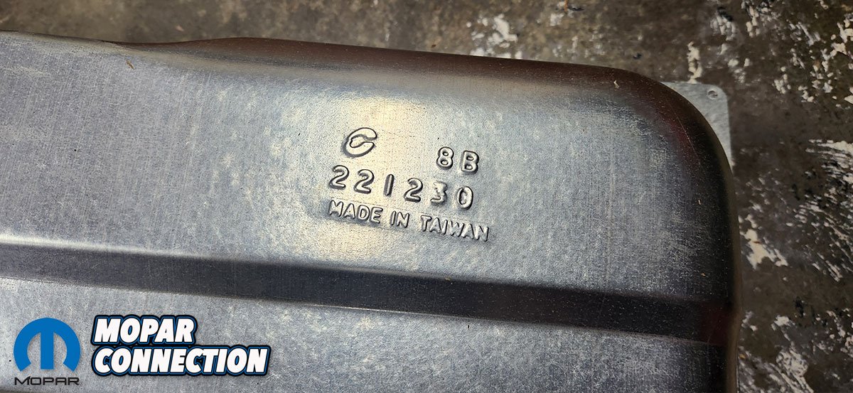 Next, we turned our attention to the fuel tank and assembling it. When comparing the reproduction fuel tank beside the original, while the overall look is very similar, there were a couple of minor differences we noticed for those that want to be picky. Firstly was the part number and Made in Taiwan declaration stamped in the tank where the factory one had nothing. Although that part is covered by the tank insulation pad and faces the trunk floor so nobody would ever see it once installed.
