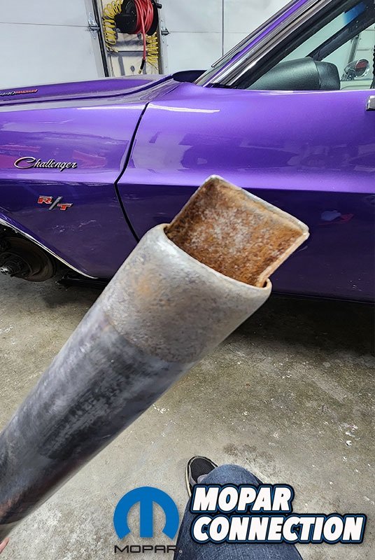 We decided the next step was to restore the fuel filler neck. Surprisingly, AMD doesn’t sell reproduction replacements but other restoration parts companies do. Our original was in great shape with only some minor surface rust inside the tube. The exterior had been crudely painted purple so our goal was to restore it back to the more proper silver finish like found from the factory.
