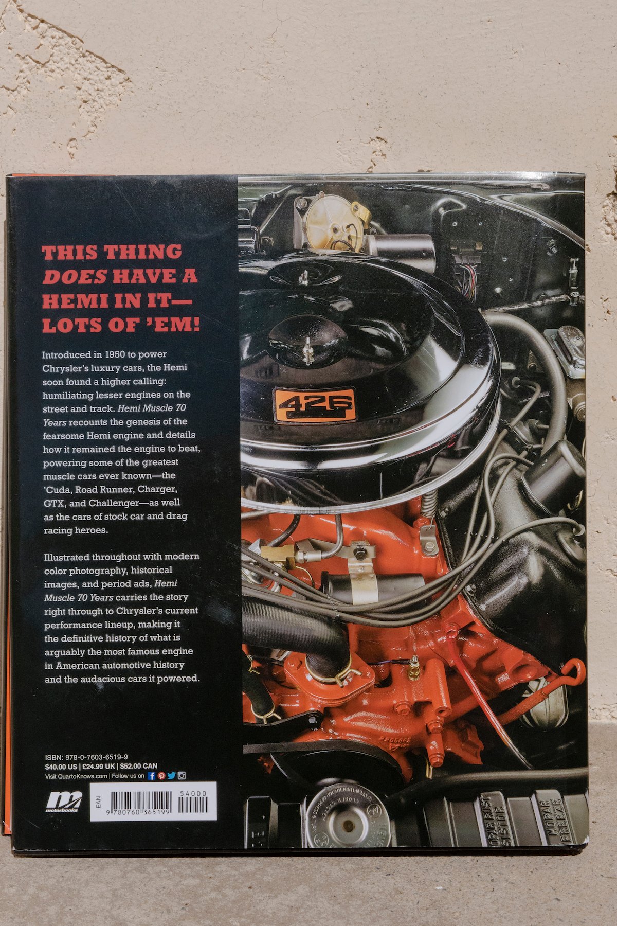 The excitement in this book starts right at the spectacular protective jacket, featuring a beautifully restored 1970s Plymouth Hemi ‘Cuda on the front cover. One of my favorite touches on the front cover of the protective jacket is that the letters spelling out “Hemi” and “70 years” are actually in the same shade of orange, as the Chrysler Hemi engine! How cool is that?! On the back of the cover, we see an incredible photograph of the famous 426 cubic-inch Hemi engine, split with a commentary about what you will find inside this great book. Just by looking at the cover, you will know right away that you’ll be in for a surprise.