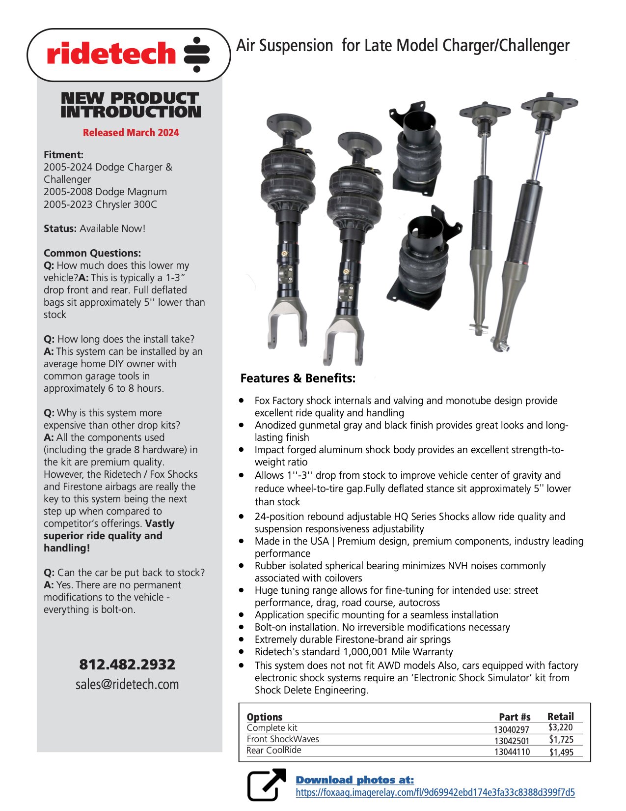 If you’re looking at radically stepping up your standard V6 or R/T, these are going to be the quickest way tighten up your cornering and improve your ride feel. Firmer suspension can help a big car feel half of its size as you whip it around the corner or the cones. And if you’ve been looking to drop your Mopar between 1-3 inches, RideTech’s airbag suspension is going give you reliable, durable performance all year long. See the two images below for details: