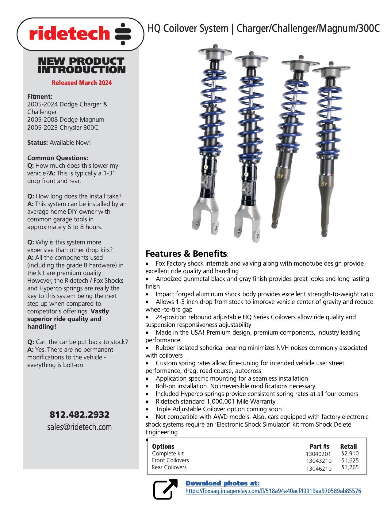 Ridetech is pleased to announce their adjustable coilover and air suspension systems are now available for the Dodge Charger, Challlenger, Magnum and Chrysler 300C. Both coilover and air suspension systems are worthy upgrades for the popular, long-running platform.