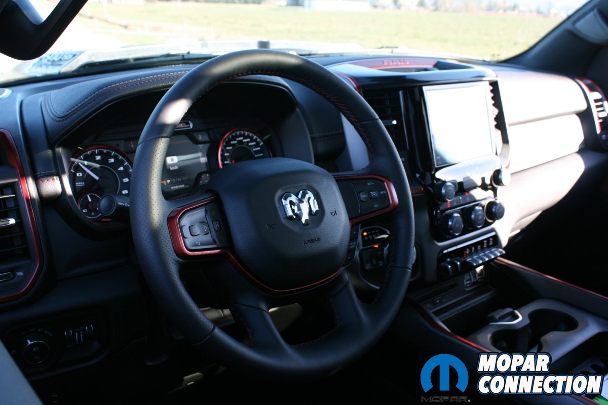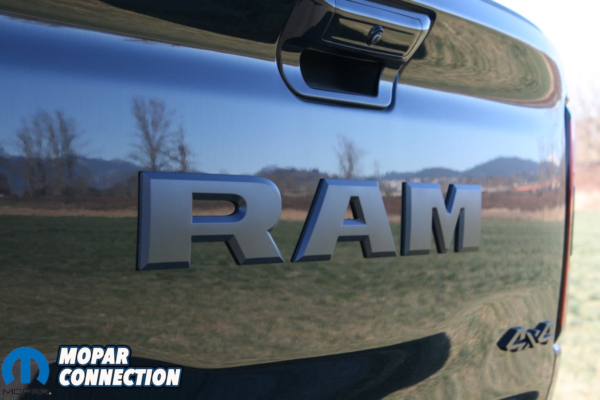 On the rear of the Rebel, Ram’s signature “Rams Head” badge on the center of the tail gate has been replaced with large “RAM” letters done in black. The new dampened tail gate feels a lot lighter than the old one and will be available with Ram’s new multi-function split tail gate option. The back bumper matches the front with a black powder-coated finish and feature dual black chrome exhaust tips. The redesigned taillights are LED and feature a black surround.