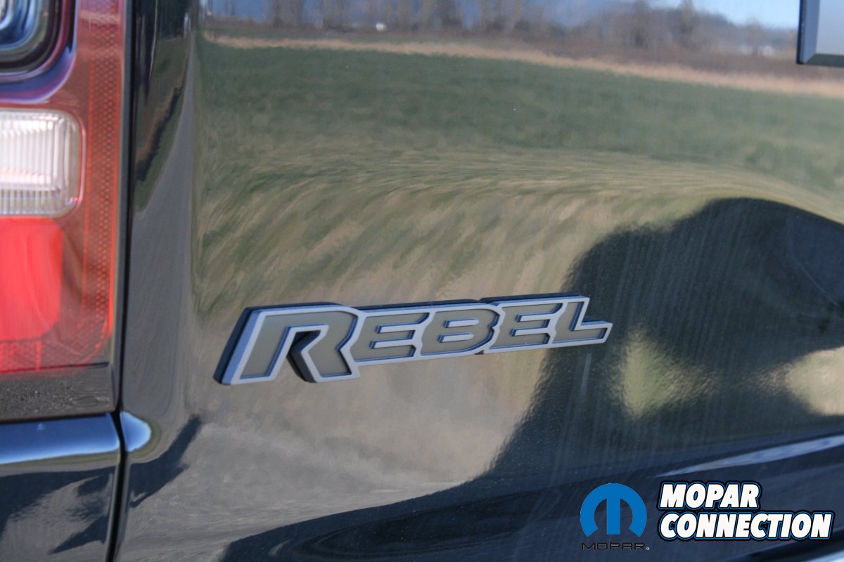 Continue down the side of the Rebel and you’ll find matte black fender flares and black badges to continue the dark theme. You’ll also find body-colored door handles and matte black 6×9” power heated mirrors. Full size heated tow mirrors are an option with the trailer tow package however they are manual fold units. We still don’t understand this as the 2500s and 3500s have power folding trailer tow mirrors that are the same part and have the same control unit.