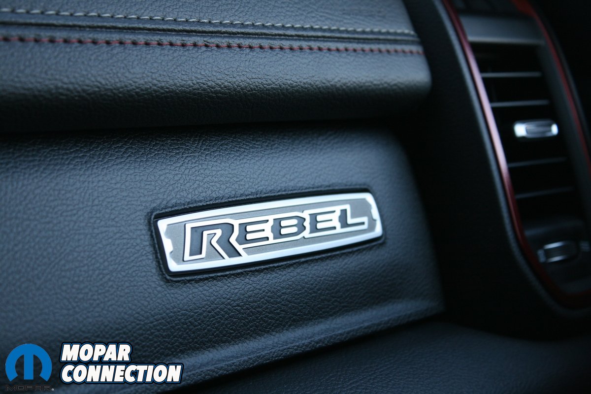 Open the door and step into comfort with the truck’s exclusive Rebel only interior. The cabin of the truck is huge and will fit four large humans easily with head and legroom to spare thanks to the slightly larger cab for 2019. The interior is all black and features Dark Ruby Red red accents everywhere; from the laser-ingrained trim pieces to the red stitching on the dash and the leather-wrapped steering wheel.