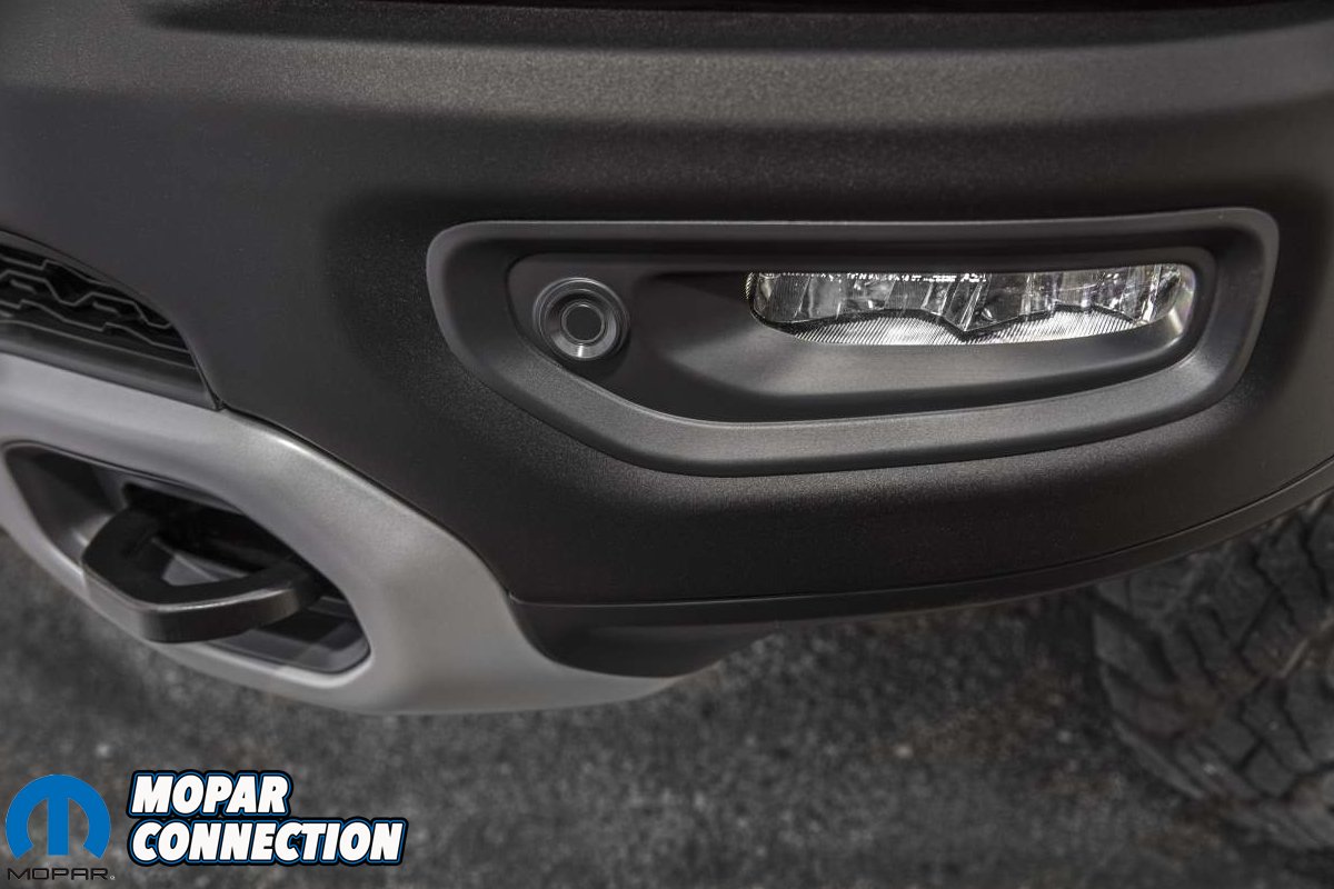 Like the previous generation of Rebel, the exterior of the 2019 Rebel features many “Rebel only” parts that give it an easy to spot quality when comparing it to other Ram 1500s. For 2019, the designers updated the front end to match the new overall redesign of the 1500 while keeping it similar to the previous Rebel. First, you will notice there is almost no chrome what so ever on the truck. The bumpers, badges, trim; everything is black. The Rebel only blacked-out grille houses silver “RAM” lettering. The usual Ram plastic and chrome/ painted front bumper assembly has been replaced with a heavy duty steel unit that has been powder coated black for durability. Again, another Rebel only feature. Underneath the front bumper, you’ll find a heavy duty silver powder-coated steel skid plate for added off-road protection.