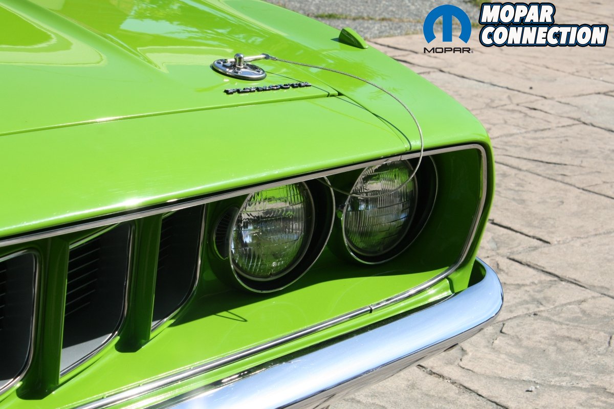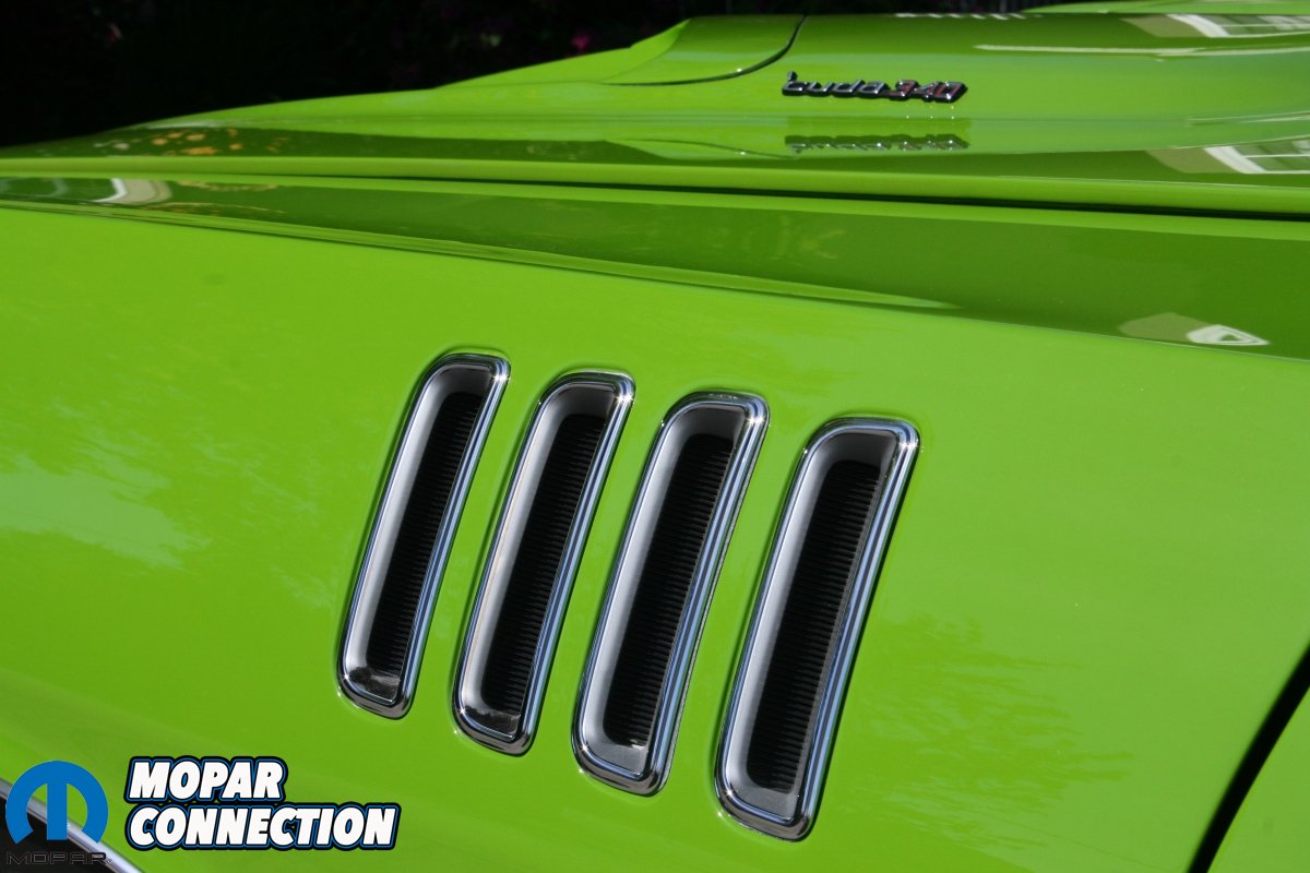 With the exception of the added white billboards, the exterior of the ‘Cuda is basically how it left the factory. Options include the color-keyed front grille, color-keyed dual racing mirrors, fender mounted turn signals and road lamps. It’s actually refreshing to see the dual scooped hood versus the optional Shaker hood. Don’t get us wrong, we love Shaker hoods but the bulk part of ‘Cudas (and especially replicas for that matter) have Shaker hoods.