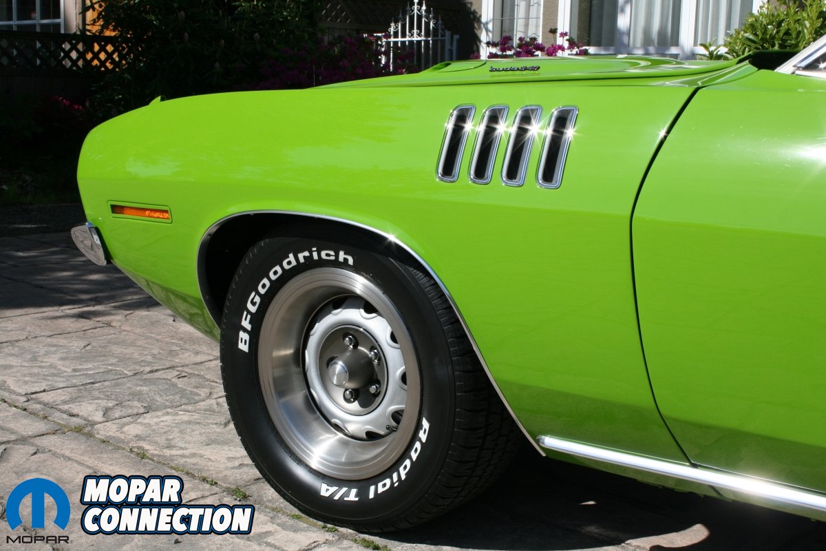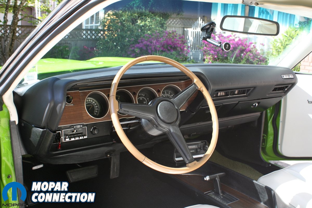 Once getting the car home, Amar got to work making some minor changes to better suit his liking. To make the Sassy Grass Green paint pop even more, Amar added white billboard decals which look right at home with the white interior and vinyl top. “I modified the car to make it more comfortable to drive while keeping it looking stock. I drive it whenever possible and use it as much as I can; on long distance road trips, to the gym, work; you name it.” The suspension was upgraded with QA1 parts. Inside, a tilt steering column and six-way manual driver’s seat were added to further add comfort. While most would have to add air conditioning, Amar’s ‘Cuda came factory with it so it was a huge bonus.