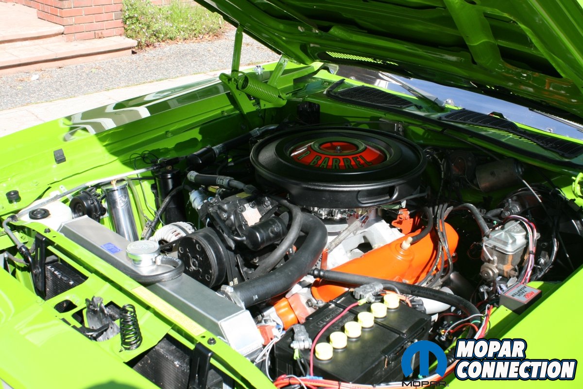 Under the hood, the original numbers matching drive train was pulled and tucked away safely to make room for a stroked out 340. A different ’71 340 was sourced and has been stroked to 416 cubic inches, produces 10:1 compression and has been fitted with a COMP camshaft, hydraulic lifters, roller rockers and Edelbrock Performer RPM cylinder heads.