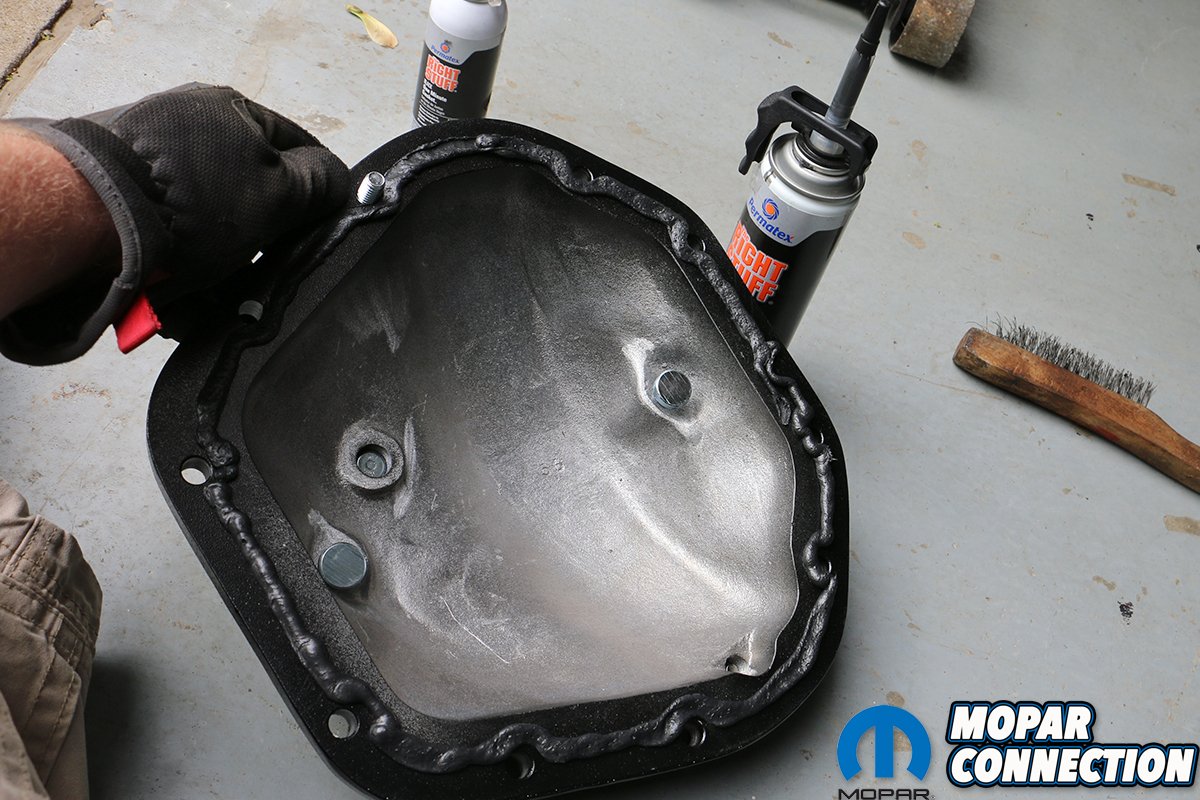 Above left: Per Proform’s instructions, we ditched the paper gasket and went with a trusty bottle of Right Stuff instant gasket maker. Sure, it’s a bit pricey, but it definitely does the job – and quick! Above right: We also applied a small amount of gasket maker (silicone is a suitable substitute as well) to the bearing cap load bolts’ threads as well as drain plugs prior to filling up the housing.