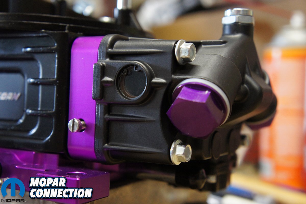 We flipped the carburetor over to get a look at the purple anodized billet base plate. You will find the same precision machining on the base plate that was found on the metering blocks. With radius edges and a smooth finish, these small details will help air and fuel to flow together easier and atomize better. They use precision throttle shafts for long term performance. All the hardware is plated to protect from rust while giving it a superior look. Proform also equipped the base plate with multiple vacuum ports for accessories or gauges.