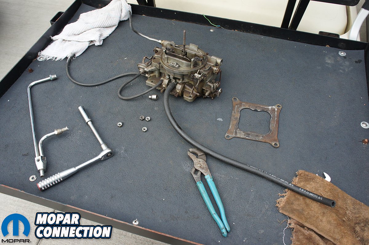 Top: Swapping carburetors only requires a few simple tools. Bottom Left: With the Carter off we were ready to slap on our Proform carburetor. Bottom Right: The gasket, hoses, and Carter carburetor have seen their better days.