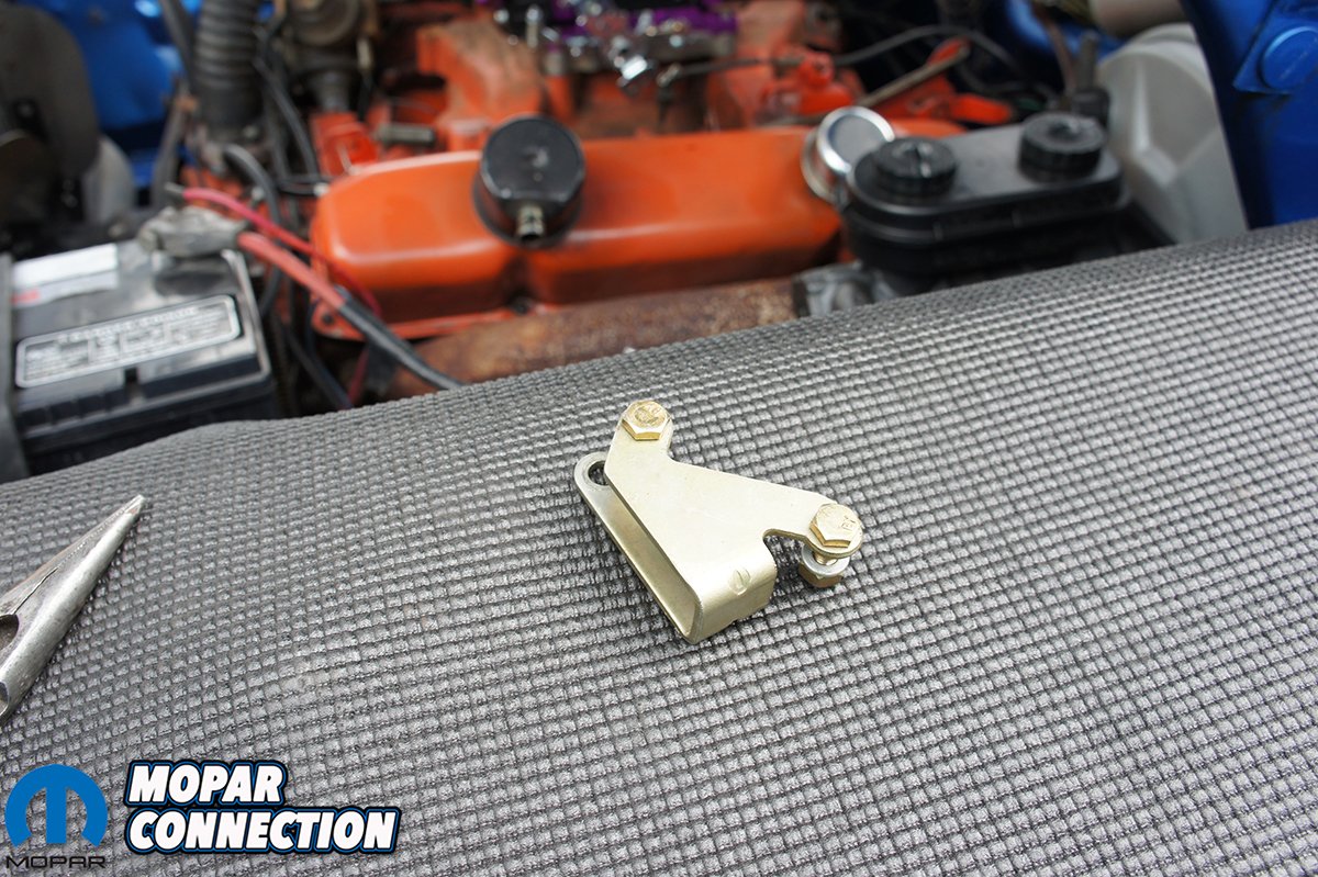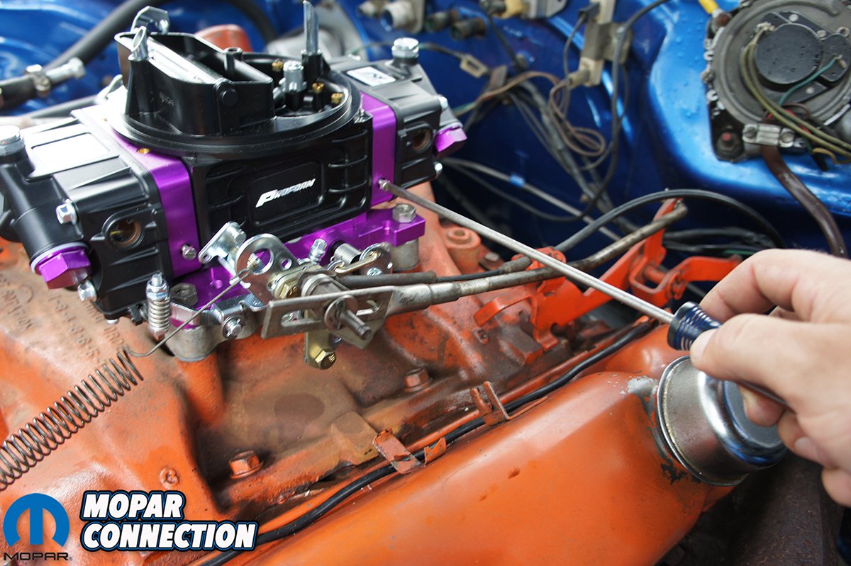 With the fuel line and carburetor bolted to the manifold we moved onto the throttle cable and kickdown linkage. Once again we had to dig though our box of carburetor parts and find a Chrysler style bracket to bolt onto the throttle bracket on Proform’s carburetor. We had no difficulty finding a bracket since Proform’s carburetors are compatible with other modular carburetor manufactures parts.