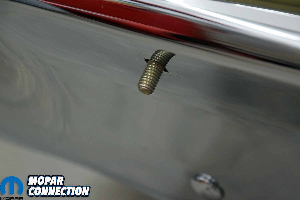 Top left: Our 1967 Dart was ordered sans bumper guards. The look is acceptable, but we saw a ’67 Dart with the factory front bumper guards, and we really liked that look. Top right: The damage-free front bumper was rechromed in 2002, and it has retained a shiny appearance since that time. Bottom left: We had to remove the upper bumper bolt on either side of the front license plate. We were pleased that each bolt’s nut backed off without any difficulty. Bottom right: We extended the bumper guard bolt through the hole vacated by the bumper bolt. The bolt was supplied with the NOS bumper guard.