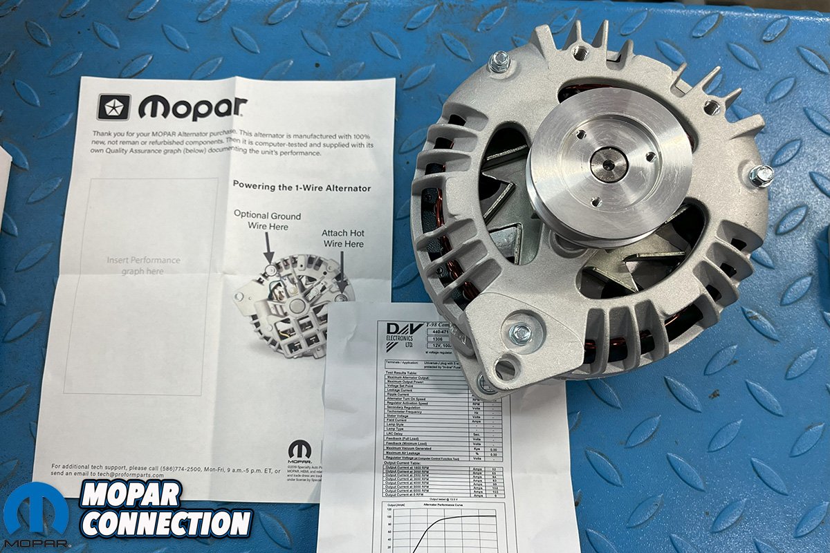 After a little research, we decided to try the Mopar 110 amp one-wire alternator. Available in three options for finish (natural, chrome and black), we opted for the natural finish (PT# 440-471). Once it arrived, we were impressed with it’s appearance; it looks great, appeared well-built and the pulley turned smoothly with no apparent runout. As far as an out of the box inspection goes, it passed our sniff test.