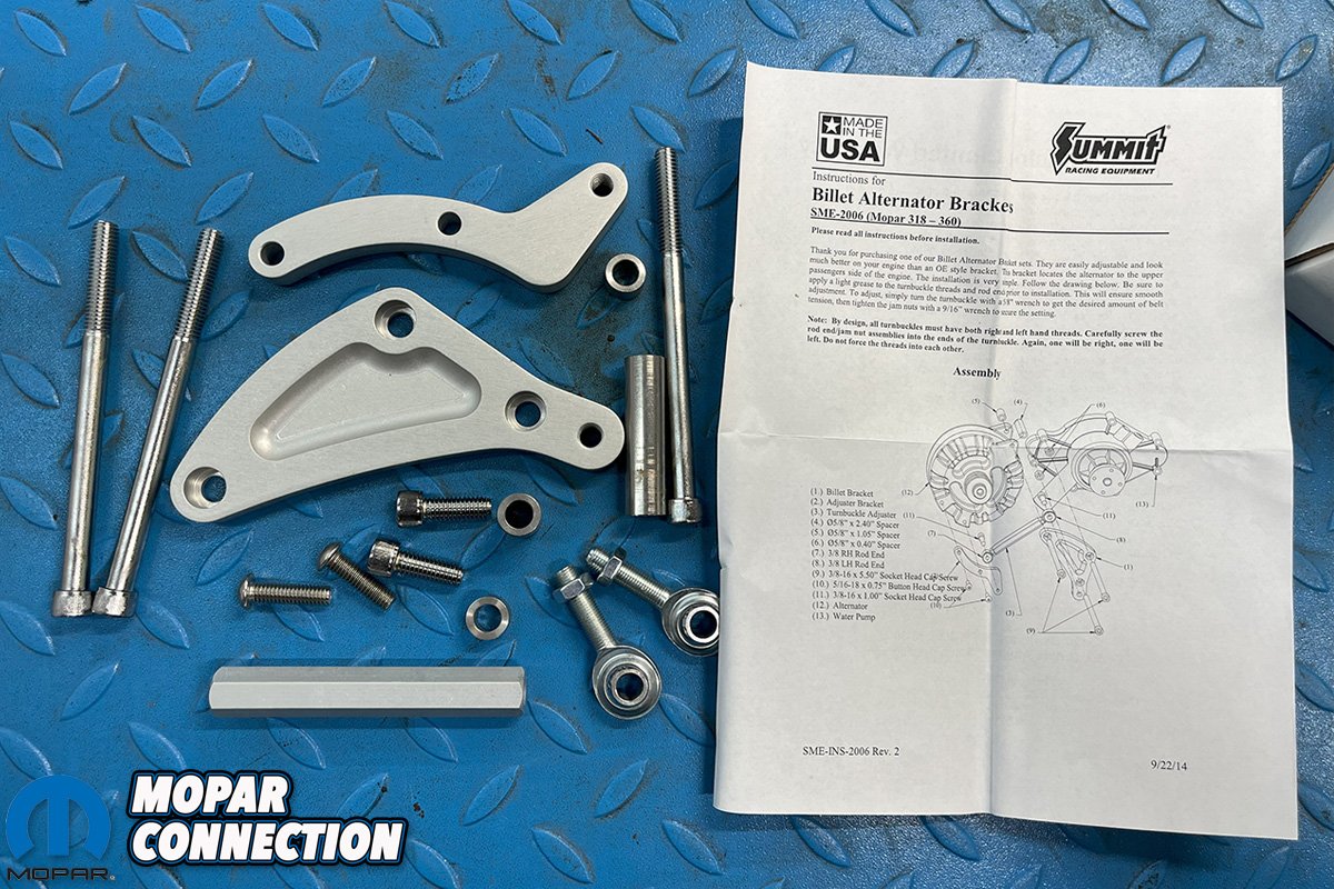 In addition to an alternator upgrade, we needed some brackets, since we had the non-OEM style Denso alternator in the car previously. After some digging on Summit Racing, we discovered the SME-2006 bracket kit and thought it looked really slick. The brackets looked sturdy and included a heim joint adjustment for tensioning the belt versus the old “pull on the alternator as hard as you can, then crank the bracket bolts down” method.