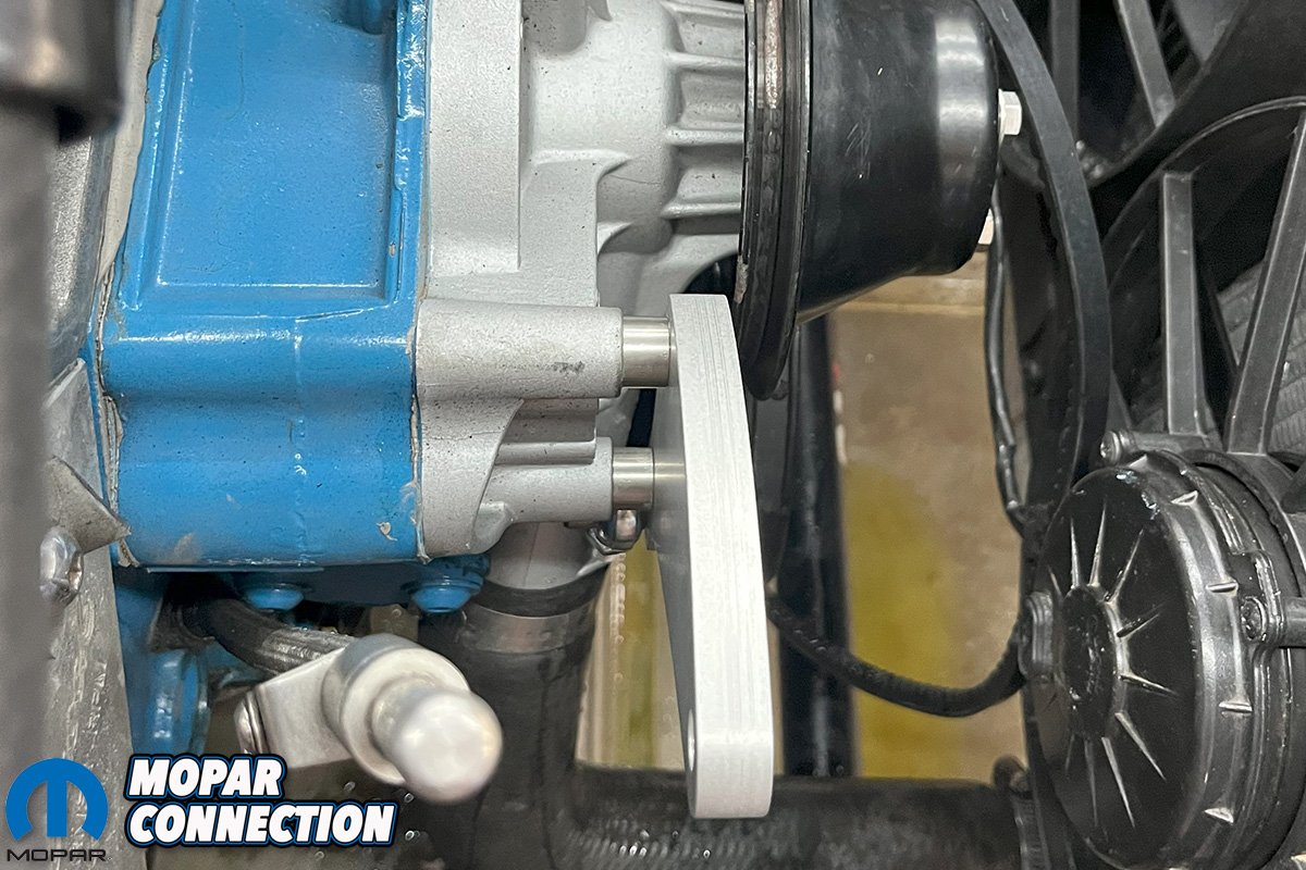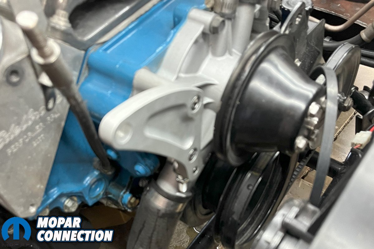 The directions with the new bracket kit are laid out well and the diagram is easy-to-follow. Those nifty studs we used during our engine assembly needed to be pulled out and replaced with the longer bolts that came in this kit. Next, we used a 5/16-inch Allen wrench to attach the heim joint end the back side of the bracket that attaches to the water pump bosses.
