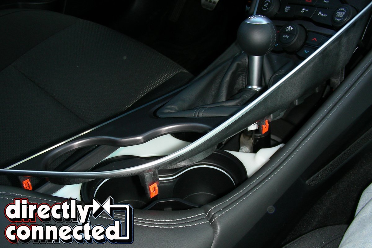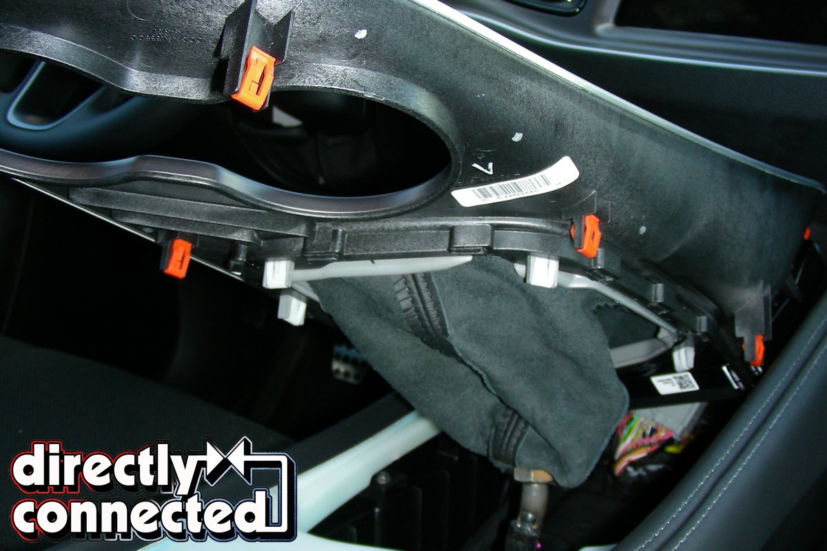 Above left: Gently lift metal trimmed console top with your fingers. The clips that attach the top to the console release very easily. Above center: Once all of the clips are released the entire console top is nearly ready to be removed. Above right: If you would like to remove the console top to make the installation easier, the next step is to release the harness clip at the front of the console. Pushing in on the lever as shown in the photo will release the clip.
