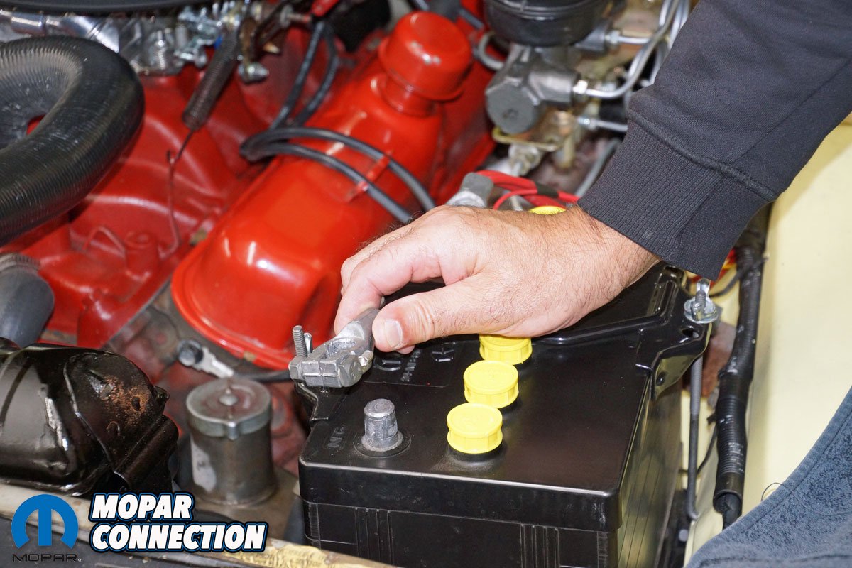Above Left: A previous owner had converted from a points regulator to a solid-state electronic regulator. The regulator and all its associated wiring were removed, and none of the components were reused because the Powermaster alternator regulates the charge voltage internally.Above Center: Our Dart has a reproduction factory appearing Absorbent Glass Mat (AGM) battery that, when fully charged, has 12.84-volts of potential. The AGM’s voltage is slightly higher than a conventional lead-acid battery voltage potential of 12.60-volts. Above Right: Before the installation of the Powermaster alternator, we tested the charging system’s output. With the engine running at 2000 rpm, we used a Sun voltage-amperage-tester (VAT-40) to load the charging system to 12-volts. The load was applied to the battery via the red and black leads attached to the battery. An inductive pickup was clamped around all the negative cables from the battery. We forced the charging system’s alternator to provide a maximum amperage output by applying a load with a carbon pile.