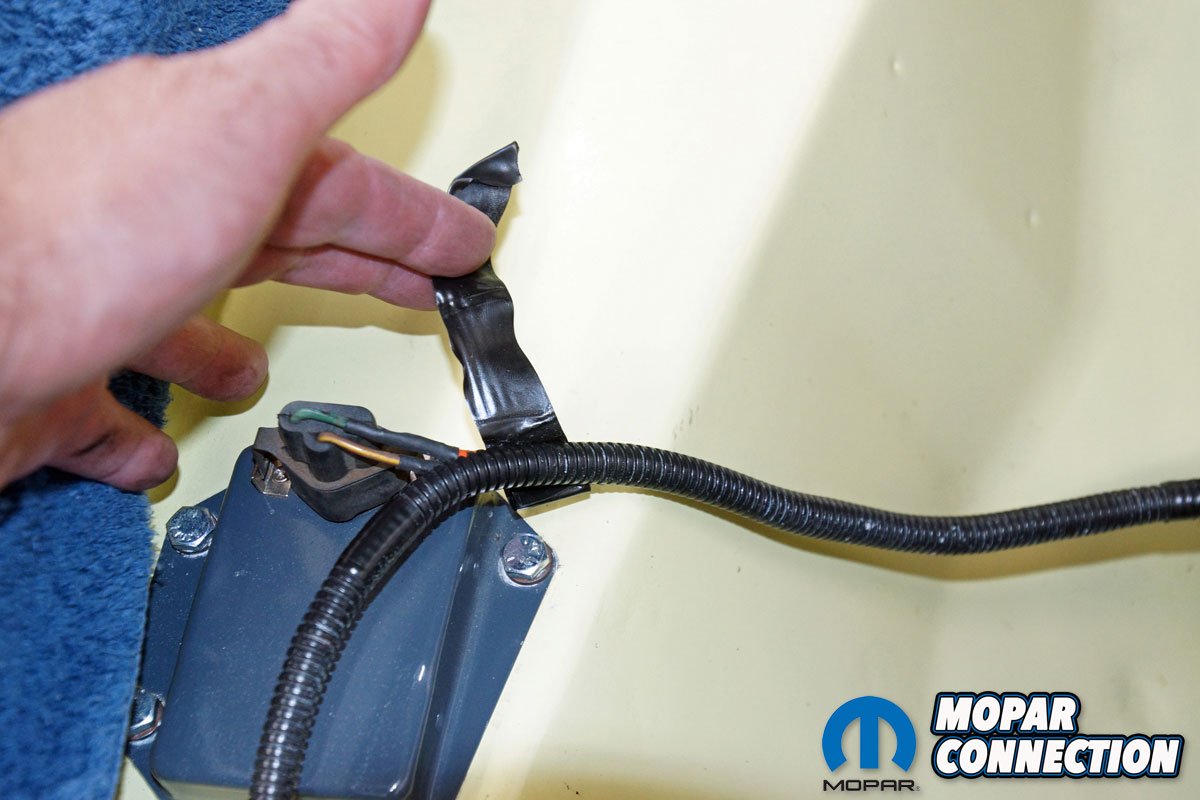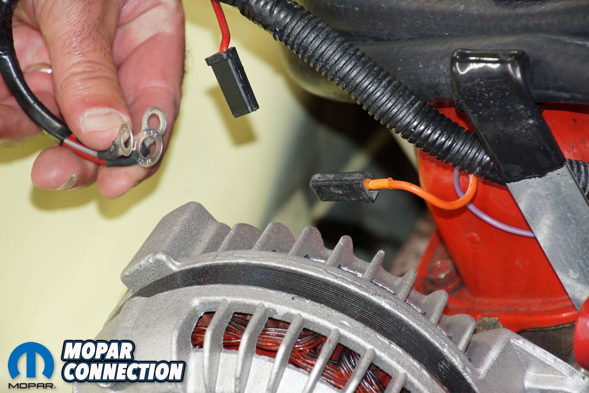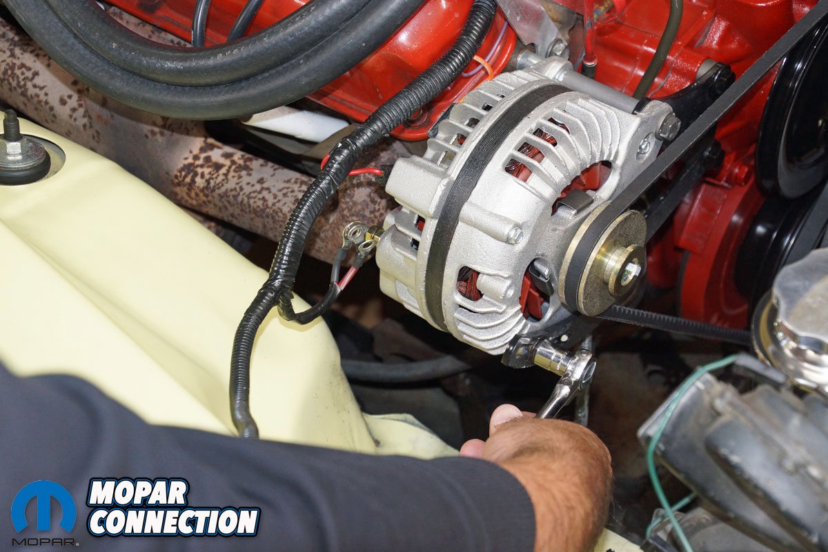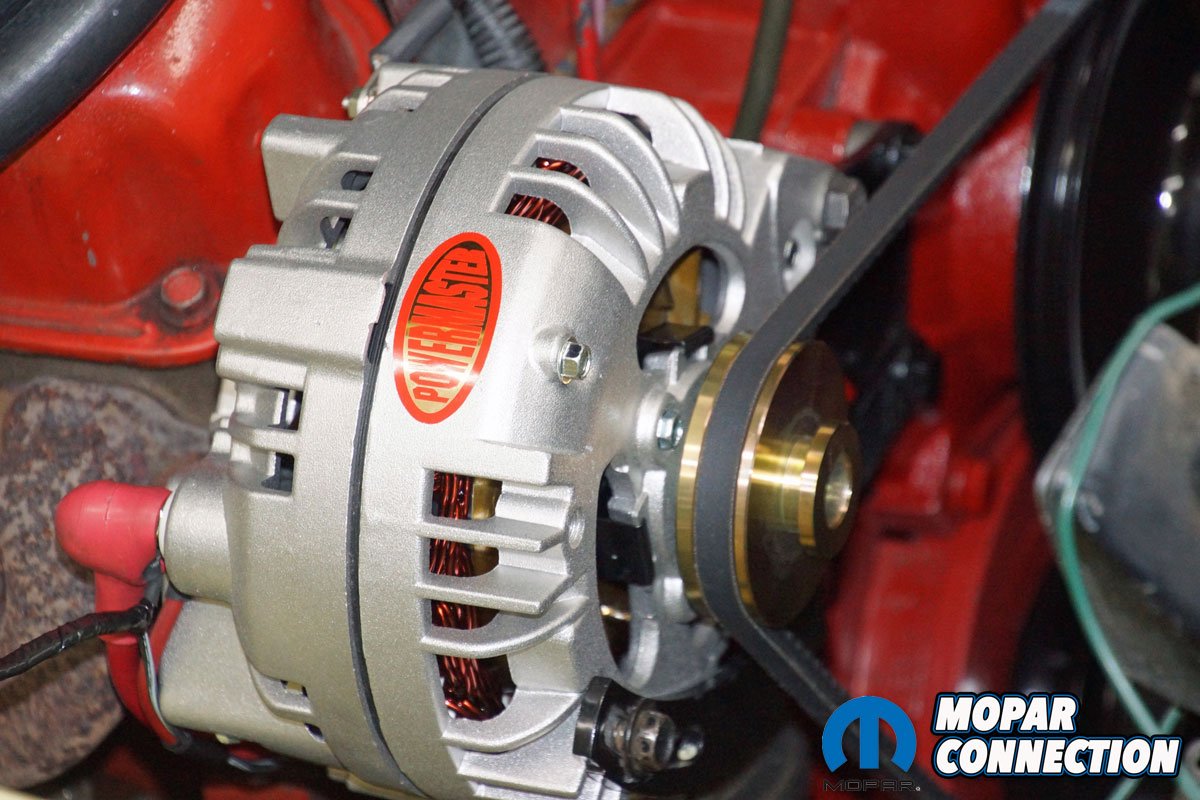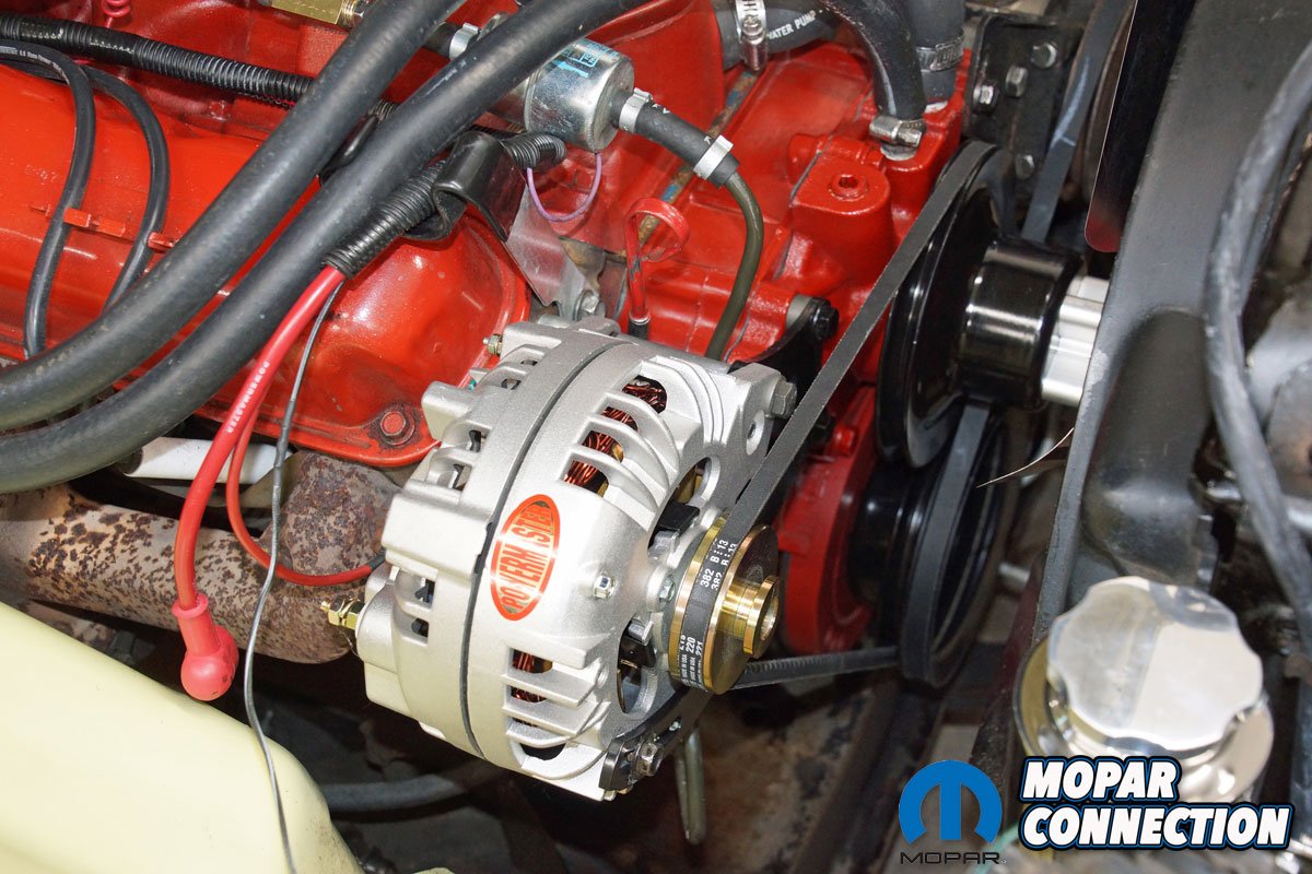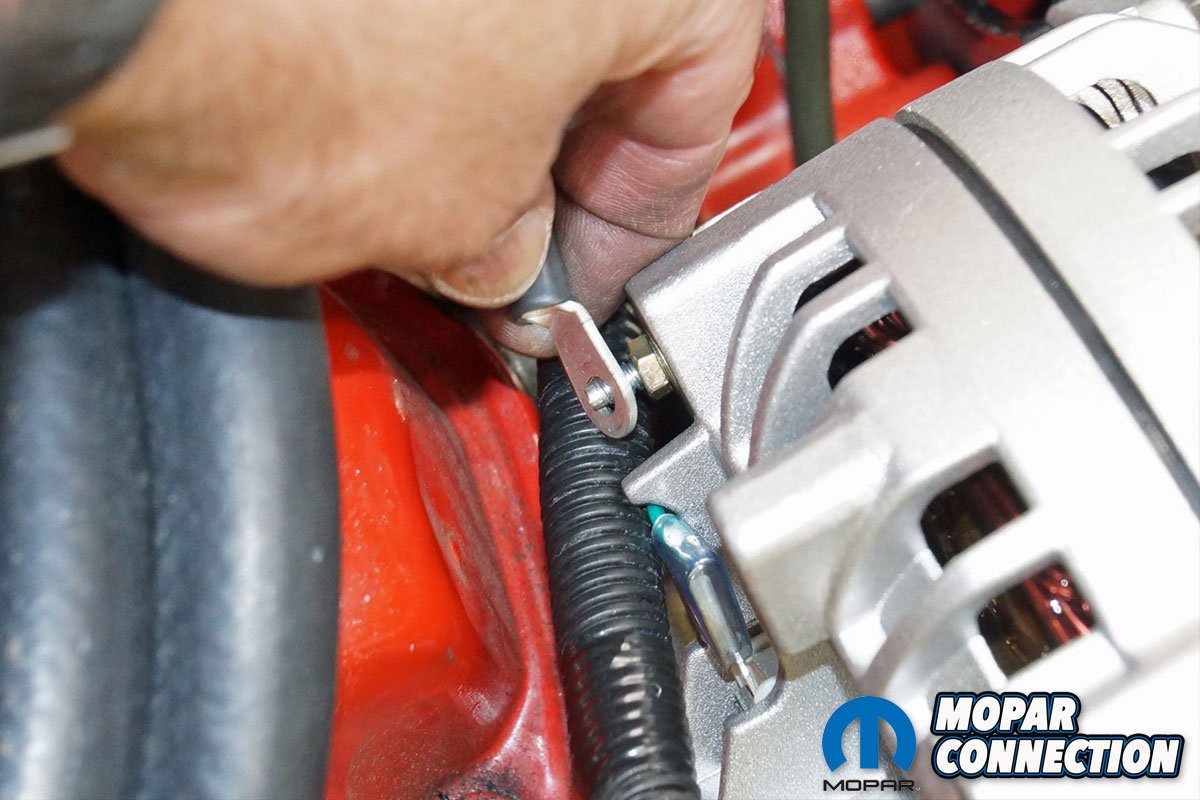The seven-foot charge wire was the perfect length for our Dart, but Powermaster offers other measurements to fit the needs of any Mopar. After the wire was run, we reinstalled the convoluted tubing over the wiring harness and turned our attention to the alternator’s installation.