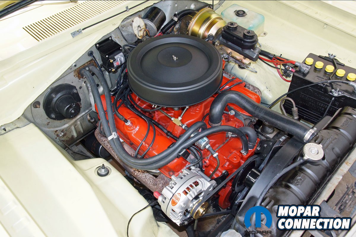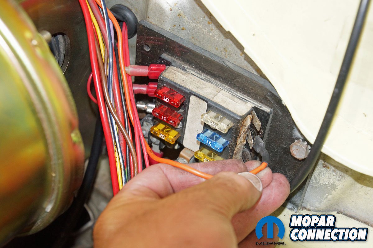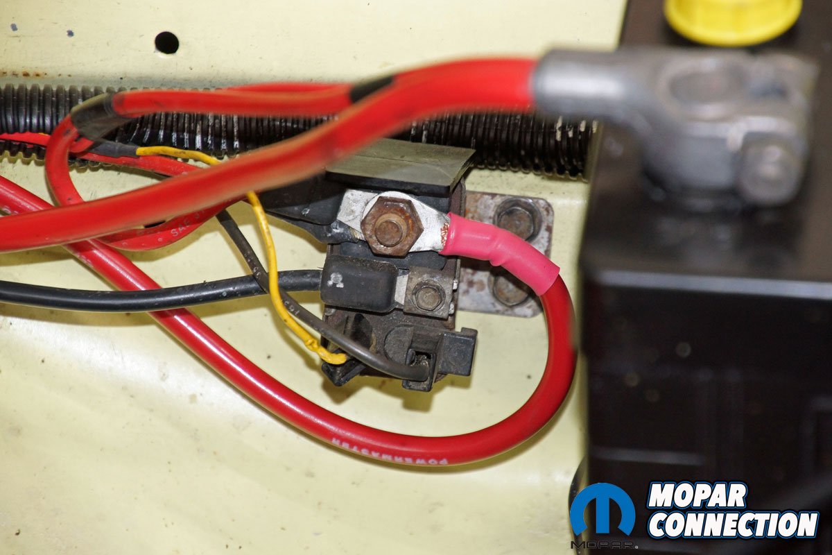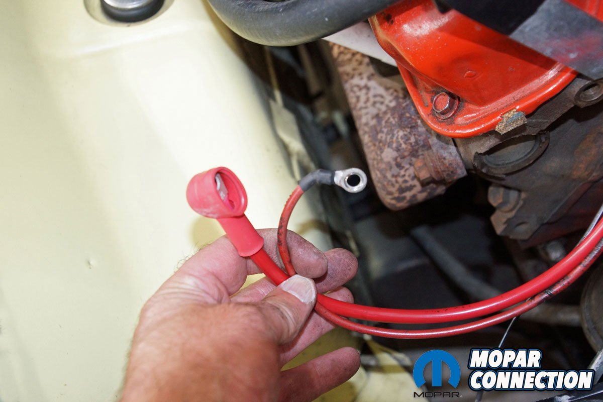 Of the three wires formerly fastened to the B+ terminal of the alternator, only two would be reused. One wire fed the ammeter (voltmeter) and the factory under dash wiring harness through an insulated hole we installed in the firewall, and the other wire was run to the horn relay. We thought the horn wire was mistakenly placed, but after a quick check of a factory shop manual wiring schematic, we discovered it was routed correctly for a ’67 V8 Dart.