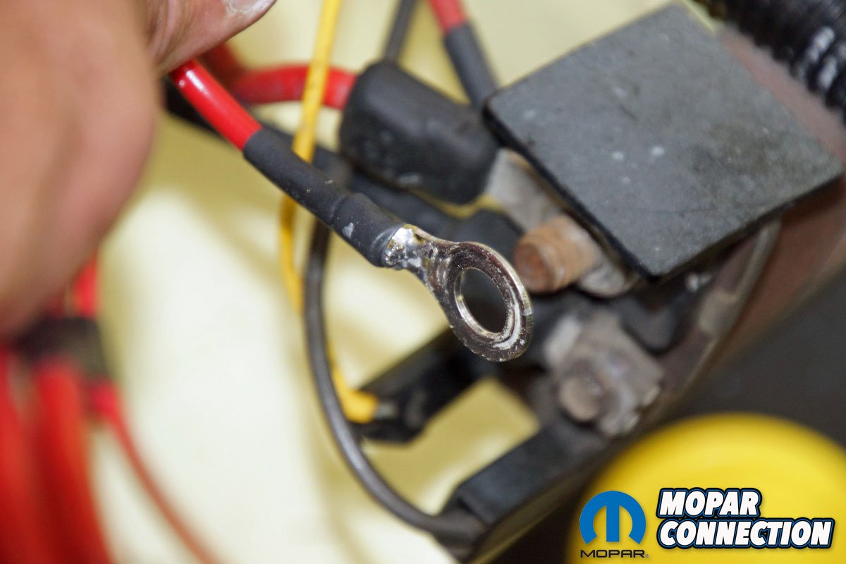 Above Left: Continuing with removing unnecessary wires, we removed the 12-volt bypass wire we had constructed and run from the B+ terminal of the alternator to the B+ stud of the starter relay. This wire could handle the 45-amp alternator’s amperage, but the Powermaster 95-amp alternator required a larger gauge wire to carry the higher amperage. Above Center: The new Powermaster charge wire (top) has a substantially greater cross-sectional diameter than the bypass wire we had constructed to work with the 45-amp alternator. The Powermaster charge wire came with the correctly sized terminal eyelets on each end, and each wire end was shrink wrapped for protection and a clean look. The wire arrived ready to install. Above Right: The new charge wire was attached to the factory starter relay B+ terminal. We ordered the wire with a 7-foot length. The long wire allowed us to loop the wire under the starter relay, which provided some slack in the wire.