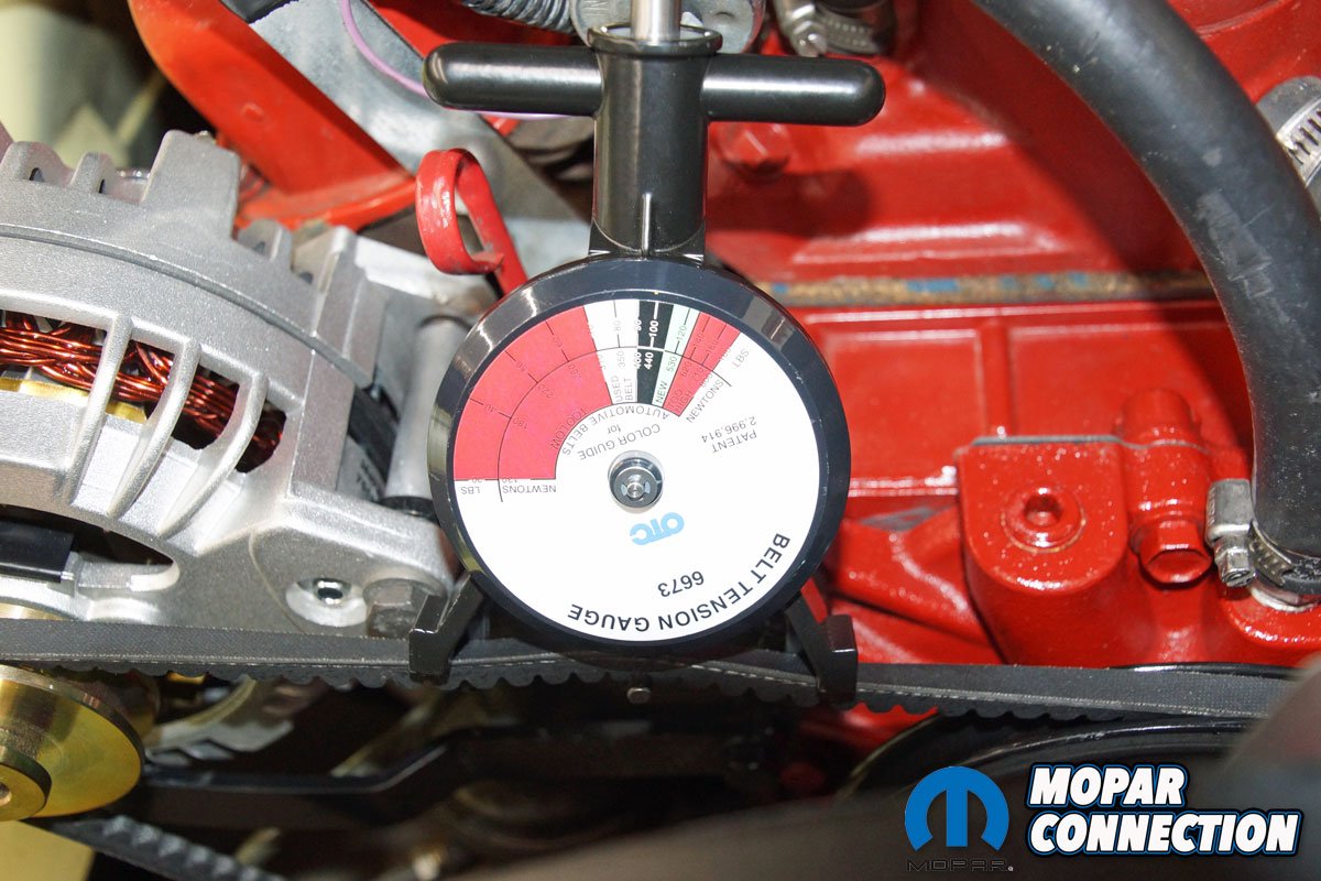 We were concerned about overtightening the belt and damaging the alternator bearings, but after Powermaster assured us the belt could not be too tight and the bearings are robust and would not be damaged, we firmly tensioned the belt. We also used our belt tension gauge to verify the belt’s tension was on the higher end of the gauge’s scale.