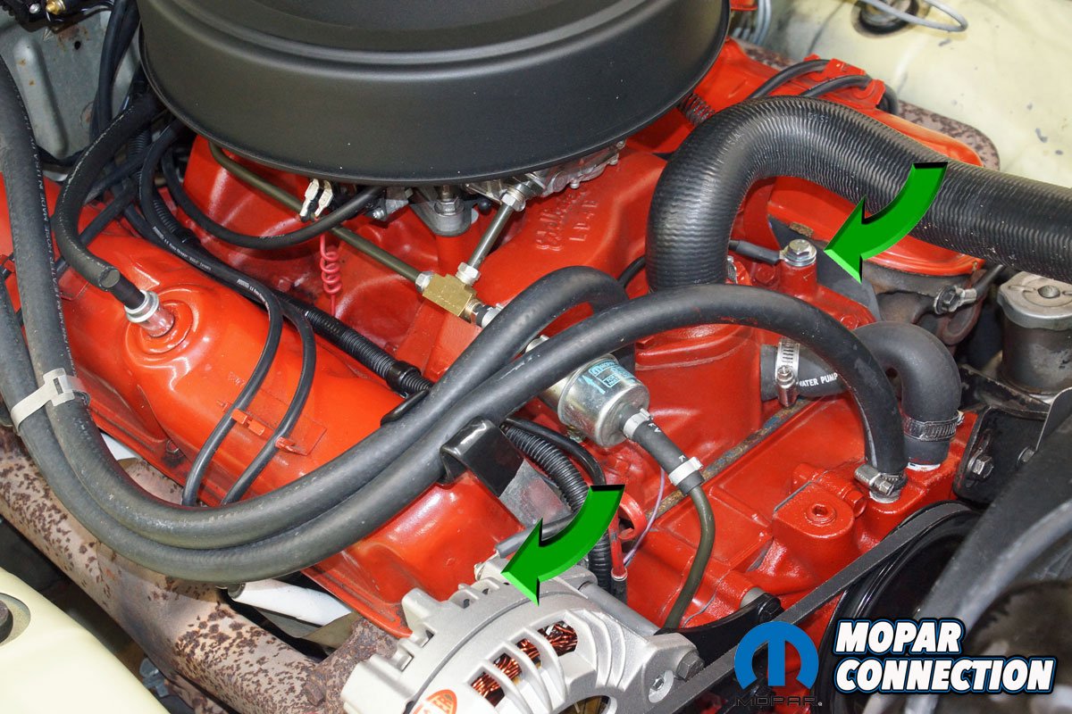 Above Left: Powermaster has developed an “Original Look” square back, one-wire, internally regulated, single v-belt 95-amp alternator (part no. 75191). The alternator fits into the factory brackets with no modifications necessary. To complement the increased amperage output, Powermaster offers 6-gauge charge and ground wires. We selected a seven-foot charge wire and a 1.5-foot ground wire. Above Center: The Powermaster Original Look alternator has a B+ terminal (blue arrow) that will attach to the new charge wire, the modified wiring to the ammeter (voltmeter), and the horn relay of our 1967 Dodge Dart. The alternator housing also includes a ground stud (green arrow), which ensures the alternator is always adequately grounded. Above Right: The Dart’s charging system included a 45-amp factory alternator that utilized two field wires. The alternator pulley was spun by a v-belt that rode on factory pulleys. The crank pulley to alternator pulley ratio was 2.41:1, which means for every single rotation of the crank, the alternator rotated almost 2.5 times.