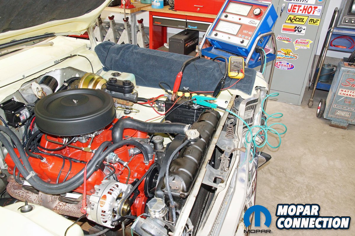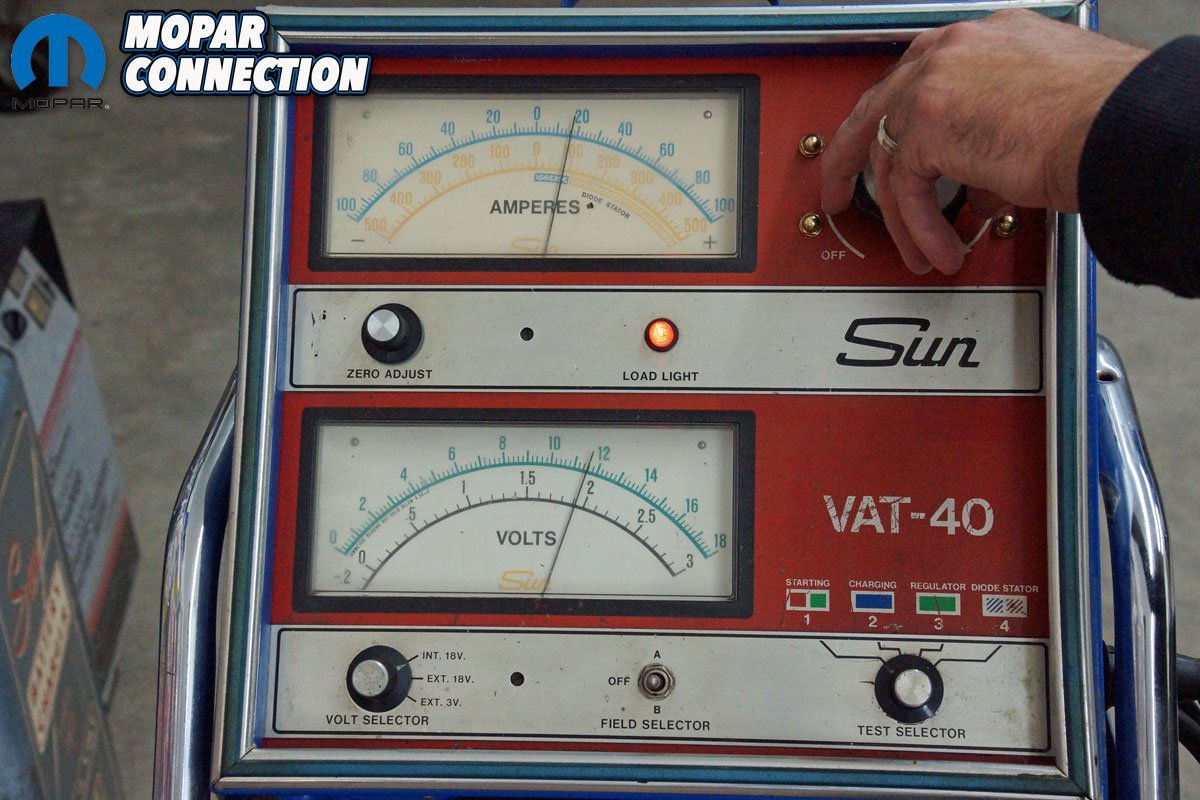 To test the alternator, we attached the leads from a Sun VAT-40 (Volt-Amp Tester) to the Dart’s battery (the black lead to negative, the red lead to positive, and the inductive pickup around all the negative battery cables). With the engine running at 2000 rpm, we loaded the charging system with the carbon pile of the VAT-40 to 12-volts, which forced the alternator to provide its maximum output to charge the battery.