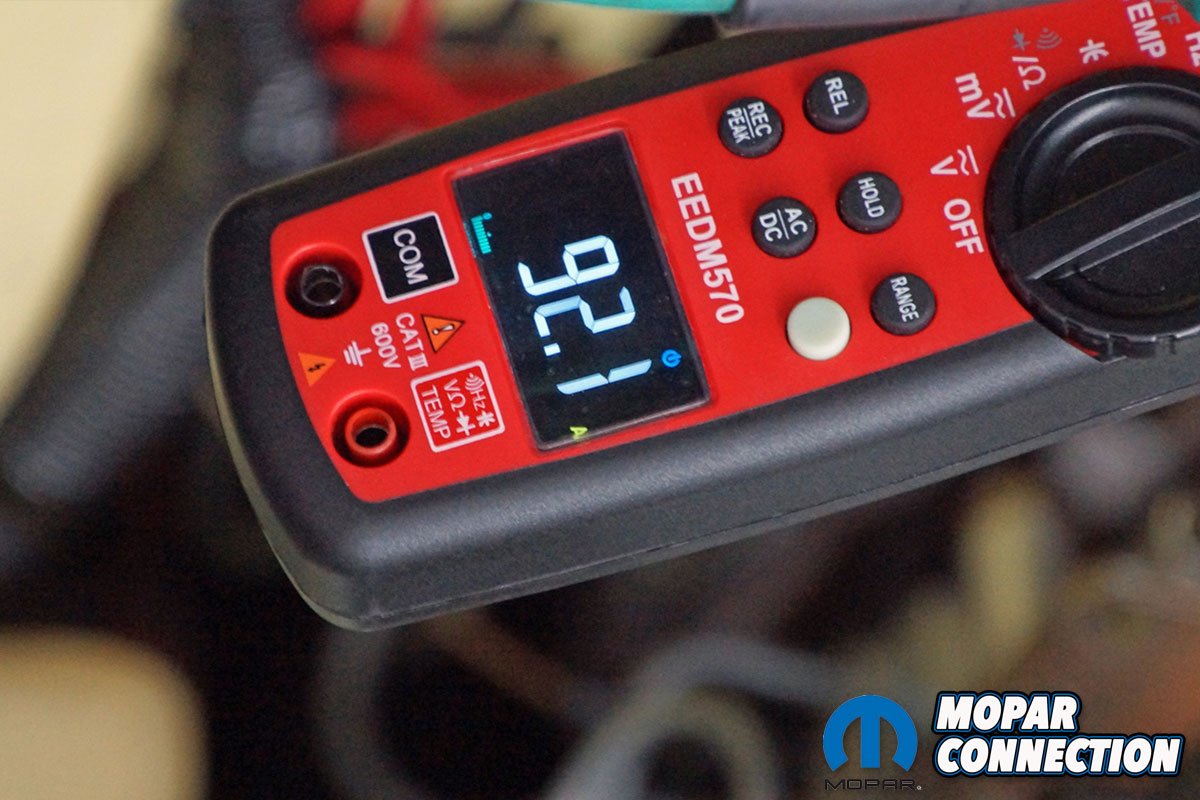 Our 45-amp rated alternator provided 40 amps, but because the VAT-40 has an analog display, we connected a more precise digital Snap-On inductive pickup (part no. EEDM570) around the negative battery cable and re-performed the load test. The Snap-On inductive pickup (amp clamp) measured 40.2 amps, well within the alternator’s acceptable range.
