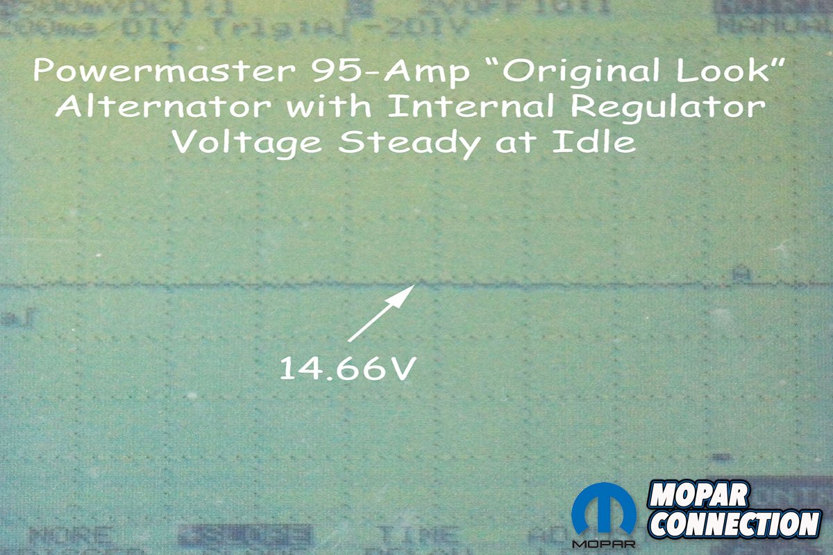 After the conversion, our ammeter (voltmeter) gauge needle quivered a bit whenever the 273 idled. A digital voltmeter connected to the battery measured an acceptable charging voltage between 13.5- to 15.5-volts. However, the charging voltage was an unsteady reading between 13.64- to 14.81-volts. A digital oscilloscope displayed a visual representation of the voltage fluctuations. The voltage would momentarily drop close to the 13.5-volt range when additional electrical loads (such as headlights) were turned on.