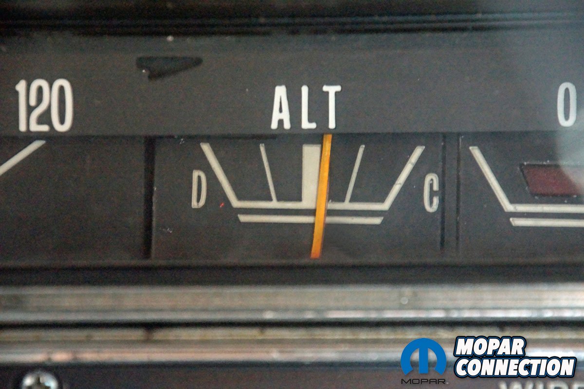 Before our Dart ownership, a previous owner had converted the charging system with a two-field alternator and a 1970s-era electronic voltage regulator. The regulator (or non-factory regulator wiring) was possibly the cause of the lag in the reaction to a change in the electrical load.