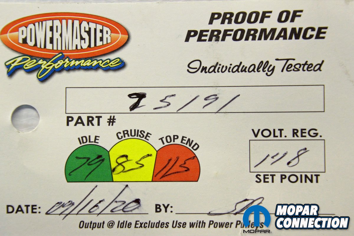 Above Left: The Powermaster alternator looks stock apart from fewer wires attached to it. If you did not look closely, the alternator seems stock. However, the high-amperage alternator dramatically increases the efficiency of the Dart’s charging system. Above Right: We have been impressed with the performance of the Powermaster alternator. A Proof of Performance card is provided with each alternator. The amperage output of the alternator tested on our Dart was equal to or slightly above the tested rating provided by Powermaster.