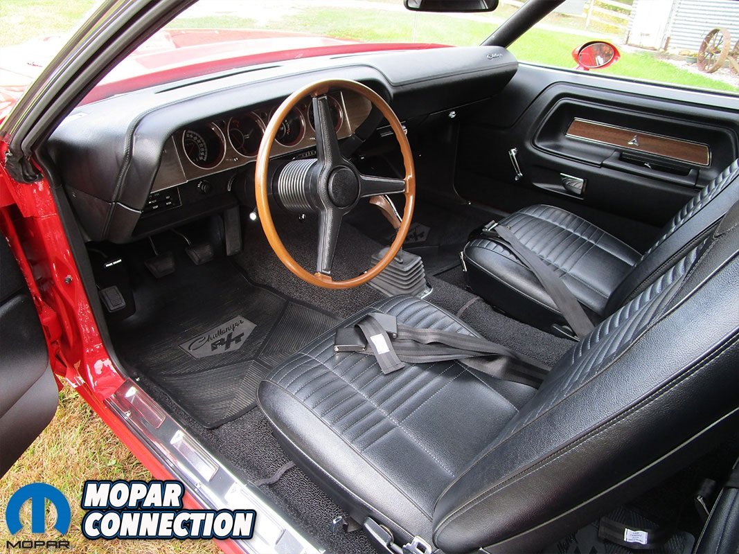 The Barracudas were quickly sold and Michael got to work restoring the Challenger. The SE donated the doors, fenders and everything else needed for the restoration right down to the bolts, screws and clips. As an auto body shop owner of Century Ave Collision in St. Paul, MN, the body and paint tasks were no problem for Michael. Once the body work was completed, the Challenger was sprayed a fresh coat of PPG FE5 Bright Red. All new glass with correct date coding was installed and all of the stainless bright work was polished and restored.