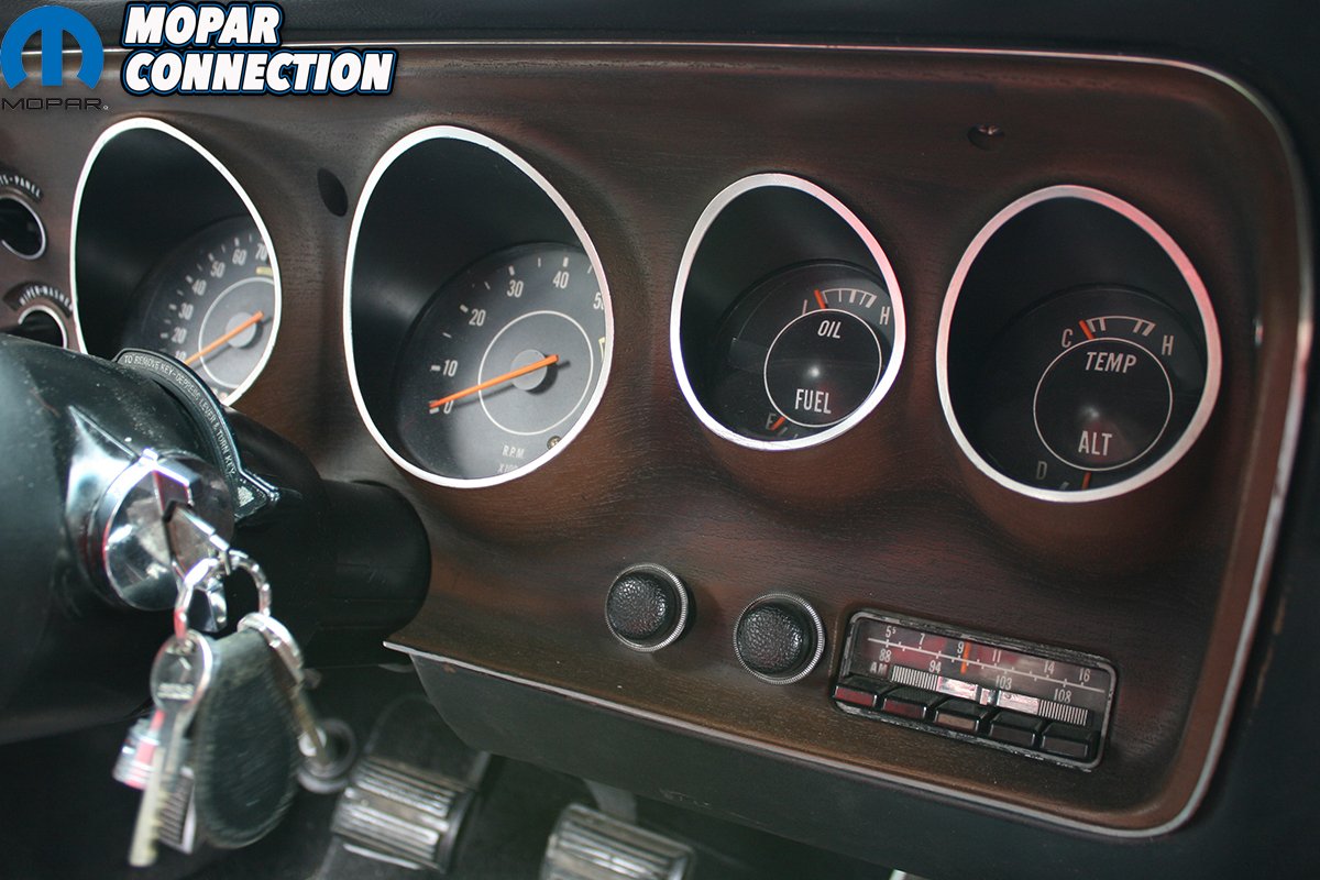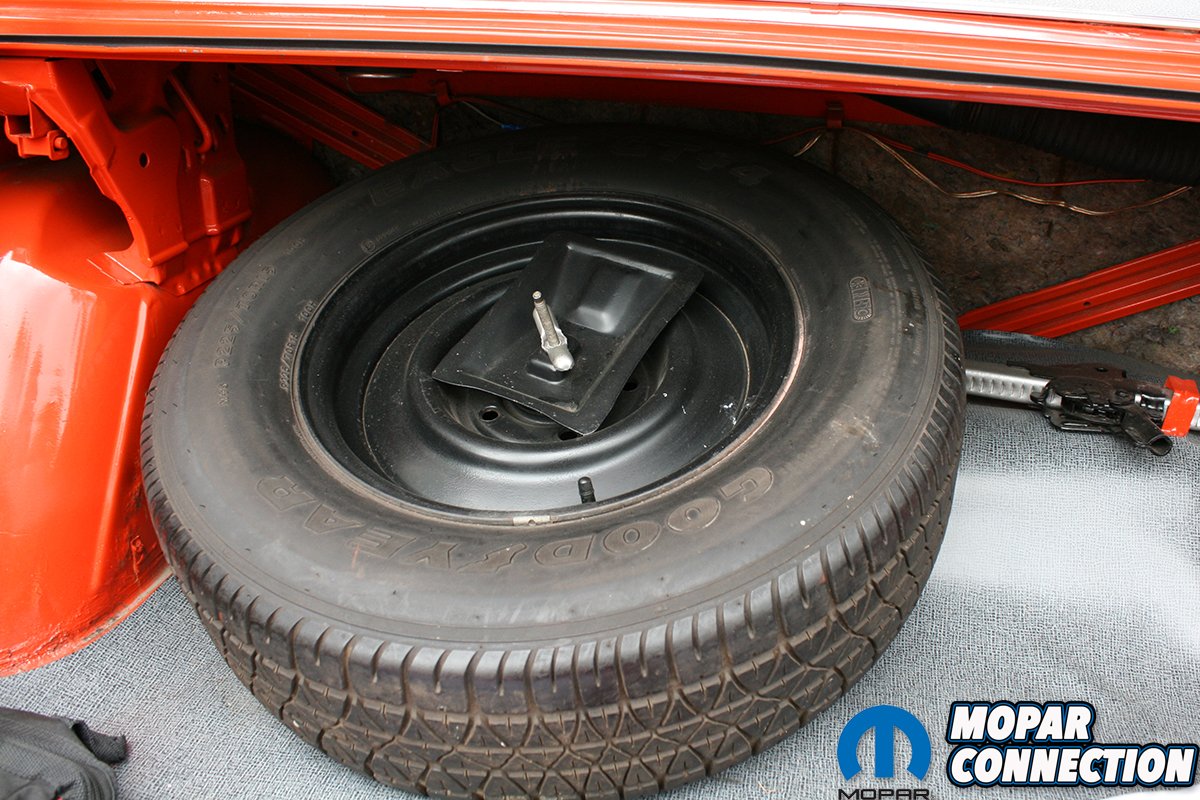 The 440 sitting between the fenders features 8.2:1 compression, 915-casting closed chamber heads with 2.14/1.81 valves, Mopar Performance .525 solid lifter camshaft, Mopar M1 intake and a 750cfm Edelbrock carburetor. The big block breathes through a pair of Hedman headers that lead into a full 2.5” system featuring 40 series Flowmaster mufflers. Topping them off is a pair of original style ‘shotgun’ exhaust tips.