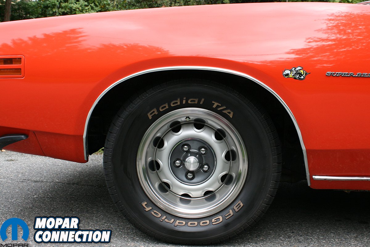 The A833 4-speed is shifted through a Centerforce dual friction clutch and legendary wood grain Hurst pistol grip shifter. The 8 ¾ rear end is fitted with an Auburn locker and 3:91 gears. The Super Bee rolls on a set of 15×7 Rallye wheels wrapped in BF Goodrich Radial T/As: 275/60R15 and 255/60R15.