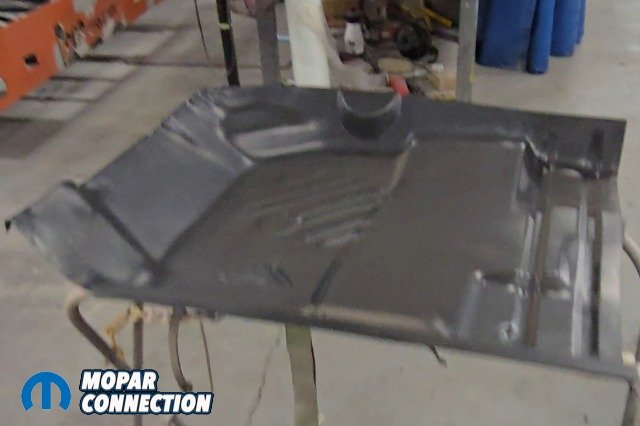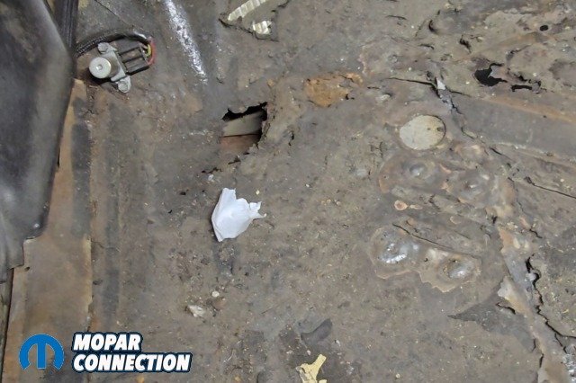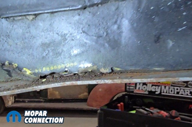 While inspecting the underbody, rust was discovered in the driver’s side floor pan. The damaged section was cut out and replaced with a partial Auto Metal Direct floor pan. This was also the perfect time to strip away the old rubberized undercoating, ensuring a clean, solid foundation for the new components that needed to be welded in.