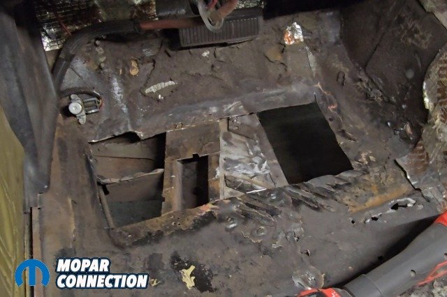 Above left & right: The front frame rails show extensive rust issues along with an old patch repair. Since this section has to be cut out anyway, it makes Speedtech’s extreme front clip chassis the perfect upgrade. Above middle: Rust didn’t stop at the rails, the floor pan was equally tired, requiring repair before the new chassis could be installed.