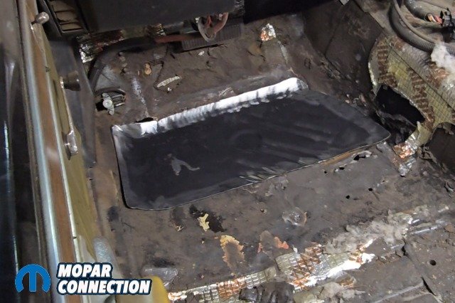 Above left: Half of a replacement floor pan from Auto Metal Direct was used to repair the rusted driver-side section. Above middle: The rusty floor pan was traced and cut out to prepare for the new panel. Above right: The new patch panel welded in place, finishing the repair with a clean, factory style look.