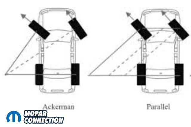 Above left: Sweet Manufacturing’s rack and pinion delivers a direct steering feel with added ackerman geometry for smoother cornering. Above right: A side by side look at steering with ackerman versus without. With ackerman, the inside front wheel turns sharper than the outside.