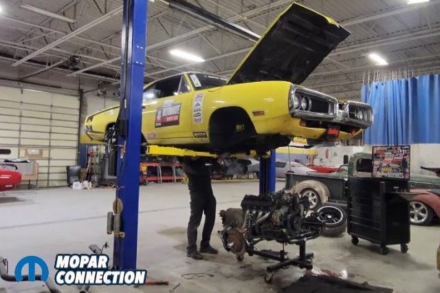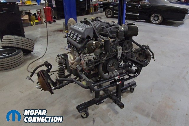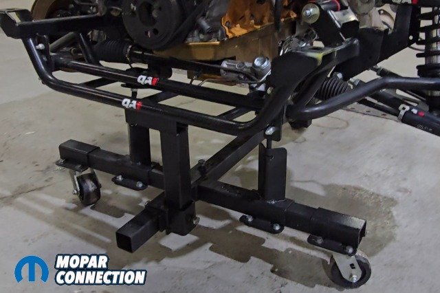 Above: Using US Car Tool’s dropout dolly, the drivetrain was lowered and rolled out from under the Superbee.